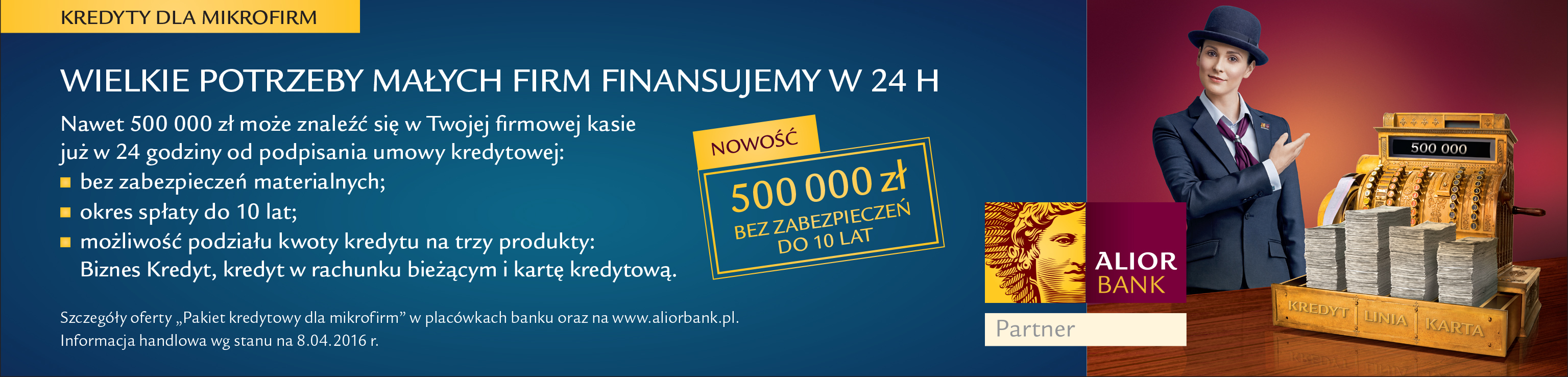 - Oferta Alior Banku łączy najlepsze cechy kredytów dla małych firm dostępnych obecnie na rynku – teraz kredyt nawet do 500 tys. zł jest dostępny szybko i w wygodny dla klienta sposób.