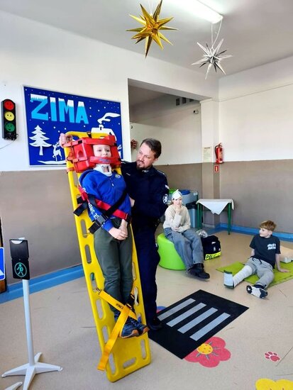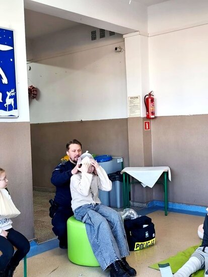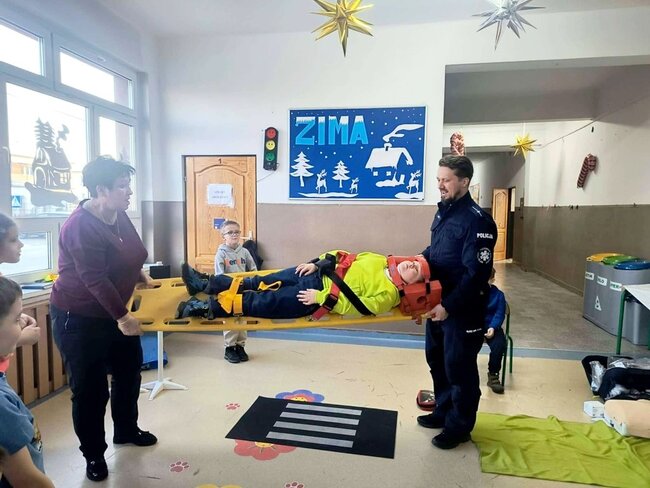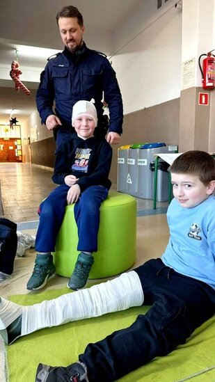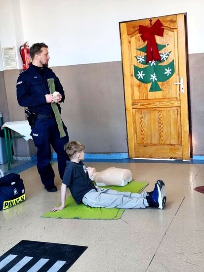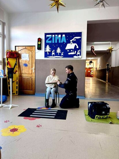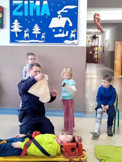 Policjant poruszył najważniejsze kwestie związane z zachowaniem bezpieczeństwa podczas zimowych zabaw. Uczniowie mieli również okazję zdobyć umiejętności praktyczne i wiedzę dotyczącą podstawowych zasad udzielania pierwszej pomocy przedmedycznej. Spotkanie było niezwykle ważną lekcją, która z pewnością wpłynie na poprawę bezpieczeństwa dzieci. Nabyte umiejętności pozwolą zachować spokój w sytuacjach wymagających udzielenia pomocy na miejscu zdarzenia. Zajęcia wzbudziły bardzo duże zainteresowanie wśród uczniów, którzy bardzo chętnie brały czynny udział w spotkaniu.