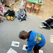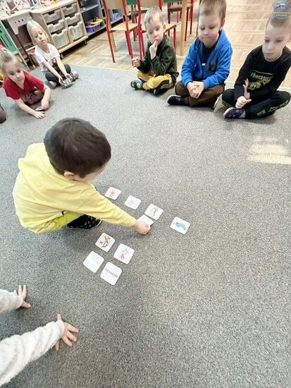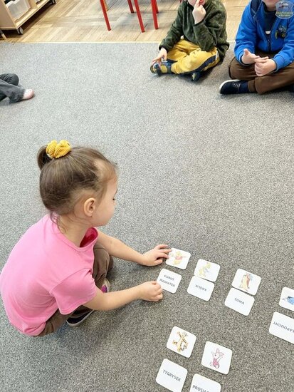 Na początku dzieci poznały postacie z bajki o Kubusiu Puchatku, przypominając sobie ich imiona oraz charakterystyczne cechy. Następnie przedszkolaki aktywnie uczestniczyły w zabawach z kartami ruchowymi, które zachęcały do aktywności fizycznej i współpracy. Nie zabrakło również zadania matematycznego — dzieci dopasowywały cyfry do odpowiedniej liczby „miodków”, ćwicząc liczenie i spostrzegawczość. Dużo radości sprawiły także zabawy z chustą animacyjną.
