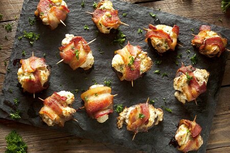 Pieczarki oczyścić, lecz nie obierać, wyciąć nóżki i część miąższu. Ser utrzeć na grubych oczkach, dodać posiekaną natkę pietruszki, rozdrobniony czosnek, pieprz, posiekane nóżki pieczarek i całość wymieszać. Tak przygotowanym farszem nadziać pieczarki, każdą owinąć plastrem boczku, spiąć wykałaczką i upiec w piekarniku w 200oC aż do ładnego zrumienienia boczku
