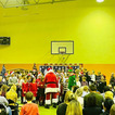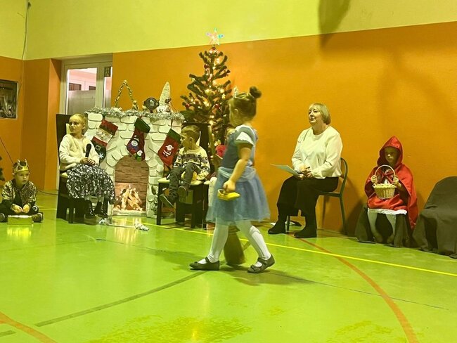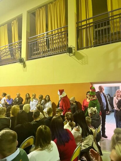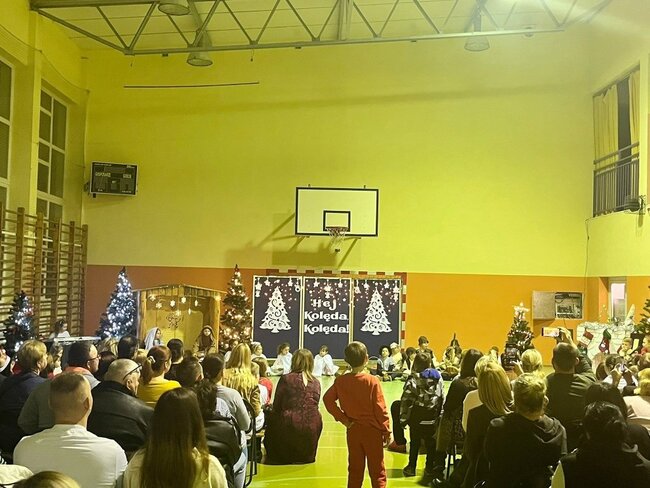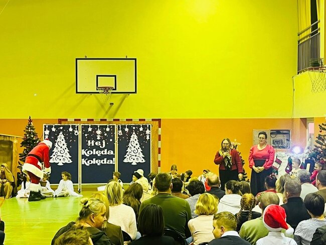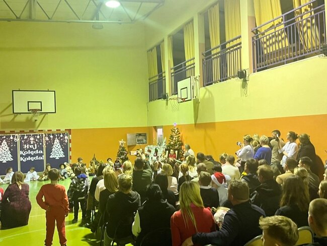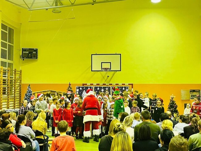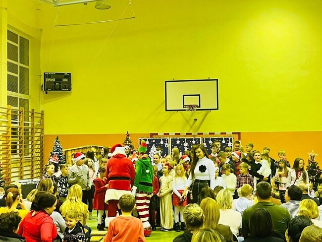Następnie uczniowie całej szkoły wspólnie zaśpiewali świąteczny utwór, który był wzruszającym przekazem życzeń dla rodziców oraz zaproszonych gości. Nie zabrakło również wyjątkowego gościa — Świętego Mikołaja, który w podziękowaniu za wspaniałe występy obdarował wszystkie dzieci słodkościami.
