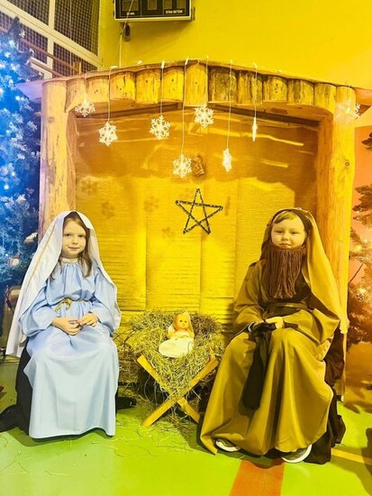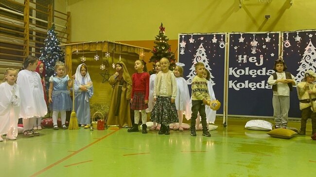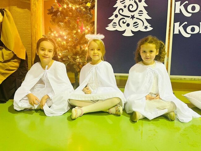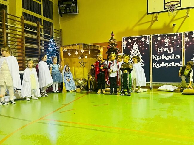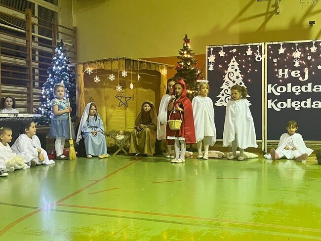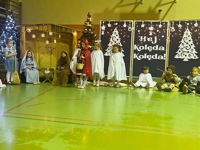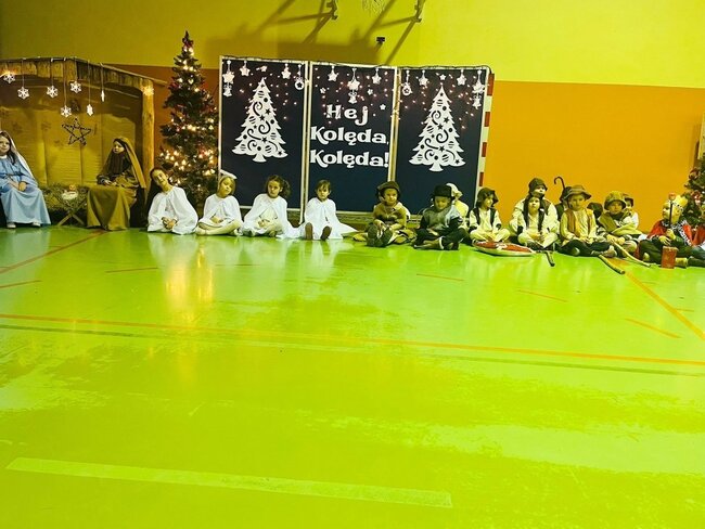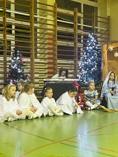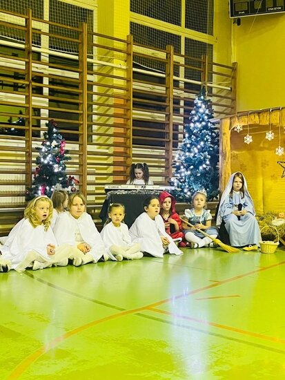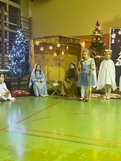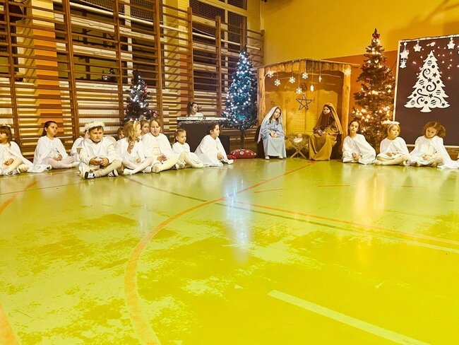 Kolejnym punktem programu był urokliwy występ oddziałów przedszkolnych, które zaprezentowały piękne jasełka. Mali artyści zachwycili publiczność, a taniec aniołków skradł serca wszystkich obecnych, wprowadzając prawdziwie świąteczny nastrój. Ogromne podziękowania kierujemy w stronę Pani Katarzyny Morzyńskiej, Pani Renaty Murawskiej i Pani Jagody Furtak za wspaniałe przygotowanie naszych najmłodszych artystów.
