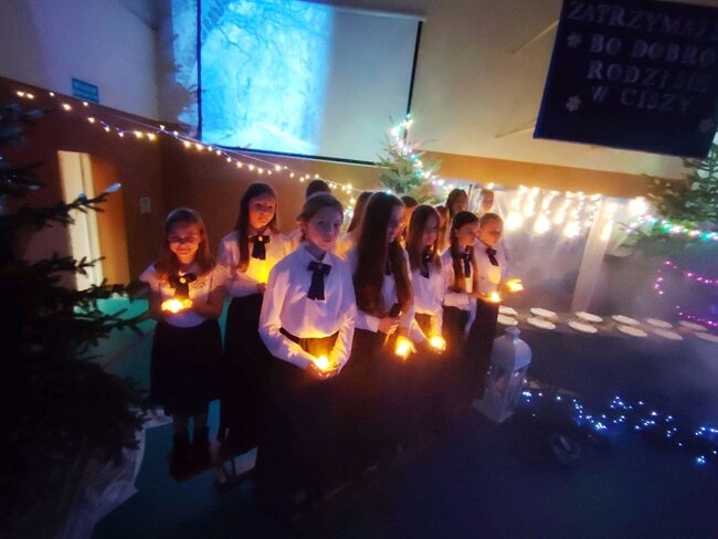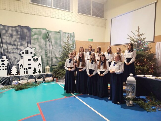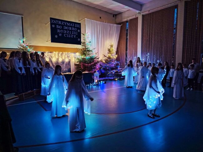 Tegoroczne spotkanie zostało połączone z wyjątkowym występem artystycznym uczniów klas 3a oraz 6a, a całość wypełniły wzruszające chwile wspólnego świętowania. Na szkolnej scenie zaprezentował się również chór szkolny, który wprowadził wszystkich w świąteczny nastrój. Uczniowie, przygotowani przez Panią Katarzynę Soja, Panią Katarzynę Kaźmierczak oraz Panią Dobromiłę Siewkowską, przedstawili program artystyczny składający się z recytacji wierszy oraz dwóch przepięknych układów tanecznych. Ich zaangażowanie i radość sprawiły, że był to prawdziwie magiczny czas.Wśród zaproszonych gości obecni byli Burmistrz Kcyni, Pan Mateusz Stachowiak, Dyrektor szkoły Pani Aleksandra Doiczman, Wicedyrektor Pani Natalia Żychlińska-Nowakowska. Na zakończenie uroczystości goście otrzymali świąteczne upominki – aniołki z serdecznymi życzeniami.