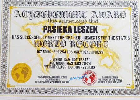 Leszek Pasieka startujący w konkurencji wyciskania sztangi leżąc w kategorii wiekowej 70–74 lata i kategorii wagowej do 100 kg zanotował znakomity wynik 167,5 kg. Rezultat ten jest nowym rekordem świata, co pozwoliło Pasiece zdobyć pierwsze miejsce i jednocześnie poprawić dotychczasowy rekord z 2019 roku, należący do Boba Levy, aż o 22,5 kg.