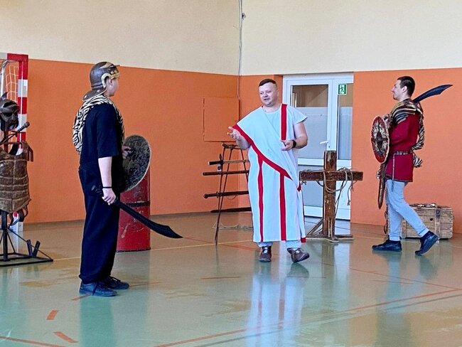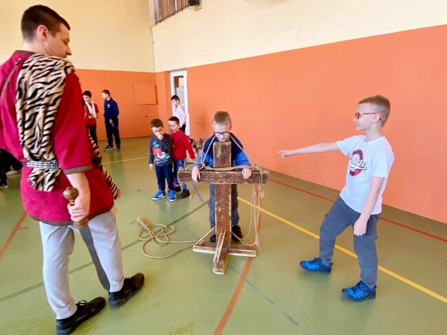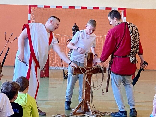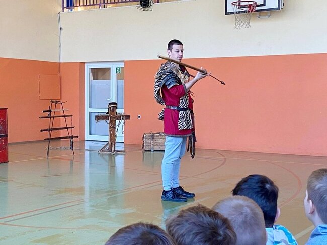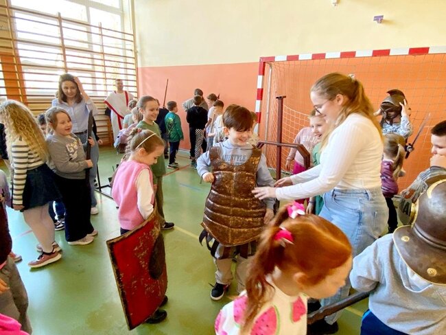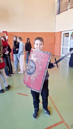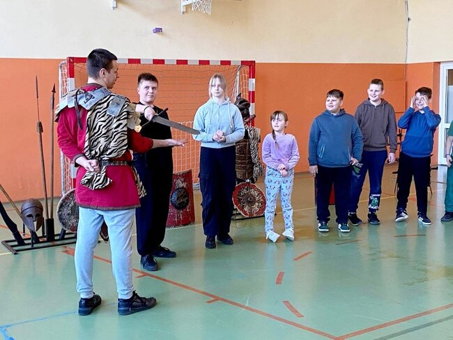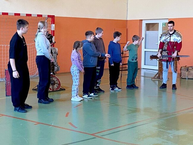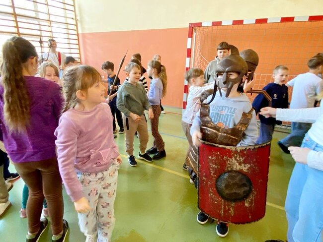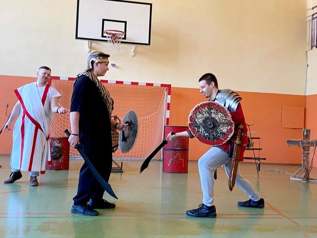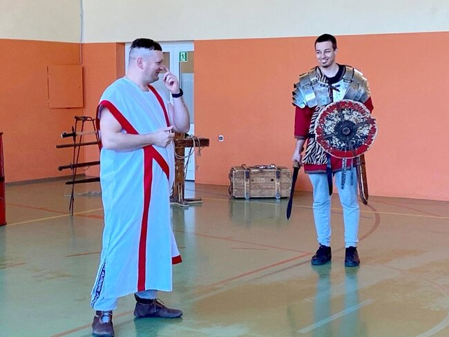 Uczniowie zostali wprowadzeni w świat starożytnego Rzymu. Poznali społeczeństwo wiecznego miasta, kulturę, podstawy prawa, wierzenia i osiągnięcia cywilizacyjne. Największym zainteresowaniem cieszył się jednak pokaz uzbrojenia i ekwipunku starożytnego legionisty i gladiatora. Uczniowie pod opieką rekonstruktorów mogli zaprezentować szyk bojowy, czy wcielić się w role legionistów.