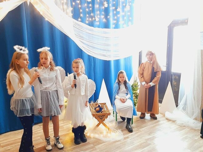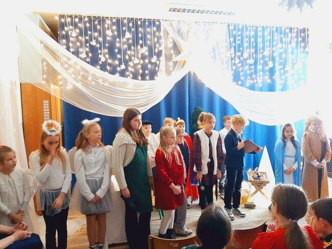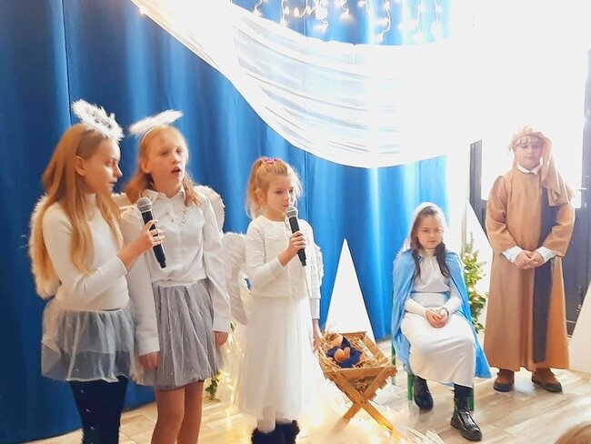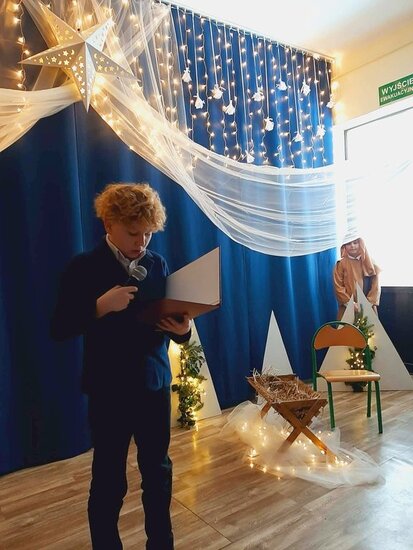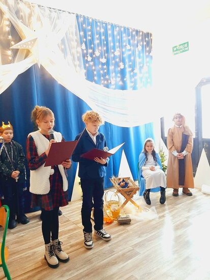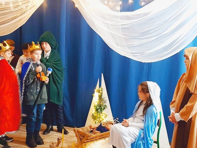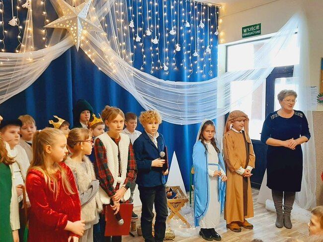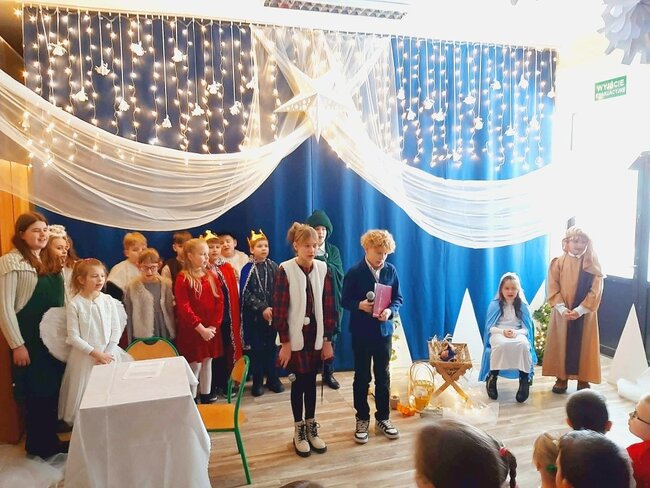 Uczniowie klasy drugiej i czwartej oraz Zuzia, Marysia, Patryk, Oliwier w pięknie przygotowanych strojach oraz w cudownej scenografii ukazali historię narodzin Chrystusa. Po zakończonym przedstawieniu głos zabrała pani dyrektor Ewa Tomaszek. Podziękowała uczniom za występ oraz złożyła życzenia noworoczne.