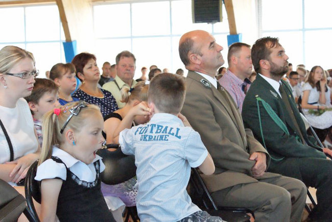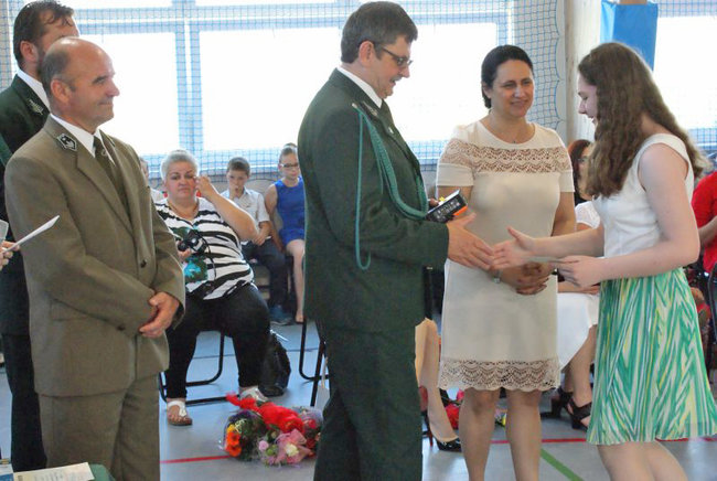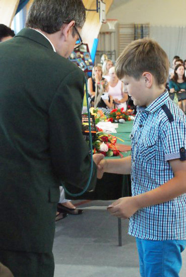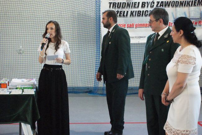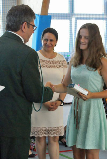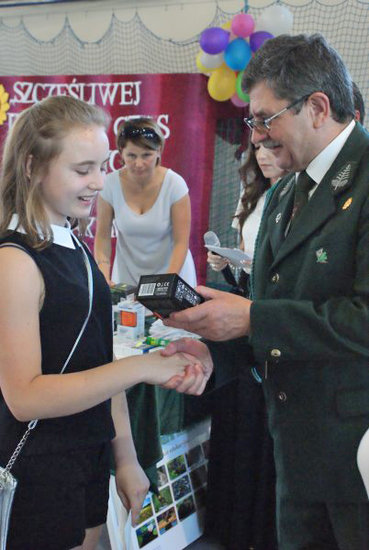 Przy okazji tej uroczystości p. M. Borzych została uhonorowana przez Kapitułę Odznaczeń Łowieckich - odznaką za zasługi dla łowiectwa. Ostatni dzień roku szkolnego 2015/2016 w Zespole Szkół w Mycielewie był radosny nie tylko ze względu na udane zakończenie wyczerpującej, ale owocnej pracy dla wszystkich uczniów i nauczycieli, ale również dzięki wyjątkowemu podsumowaniu wspólnej współpracy szkoły i Koła Łowieckiego nr 9 GWARDIA w Bydgoszczy na którym gościliśmy p. W Majewskiego, p. K. Stosika i p. A. Krokosa.