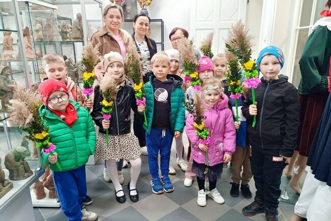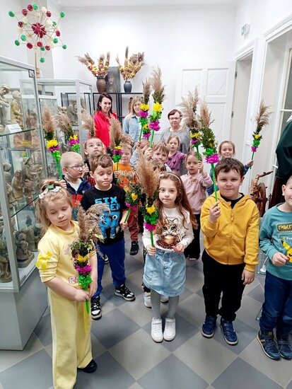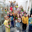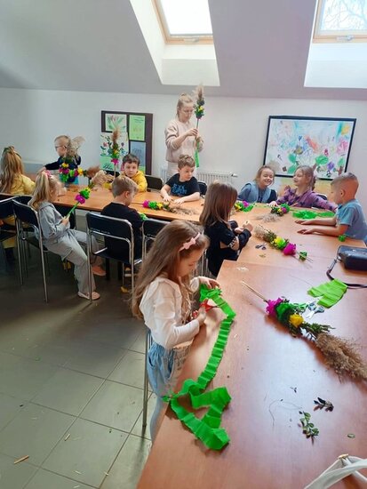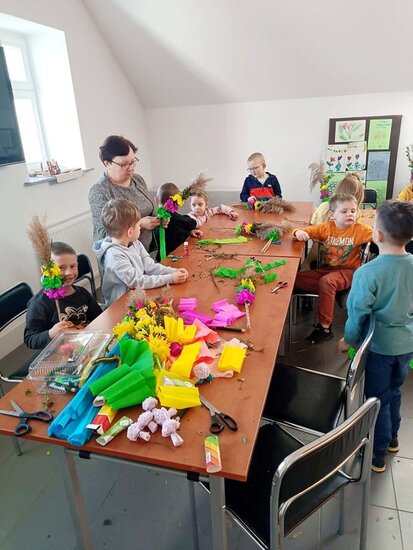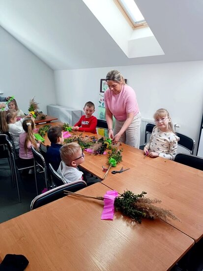 Podczas warsztatów mali uczestnicy z ogromnym zaangażowaniem wykonywali tradycyjne palmy wielkanocne. Było kolorowo, kreatywnie i bardzo radośnie!