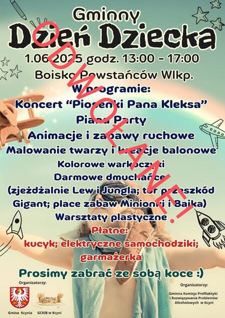 W związku z zapowiadanymi na jutro niekorzystnymi #warunkami atmosferycznymi, Gminny Dzień Dziecka zostaje przełożony na inny dzień.