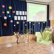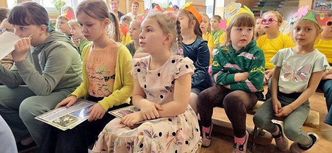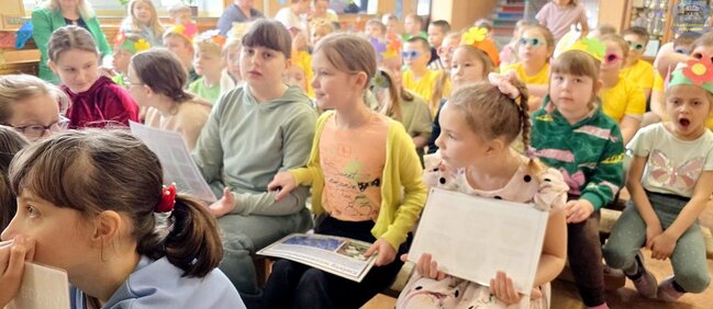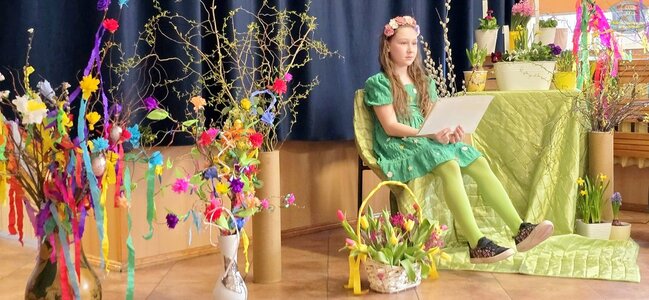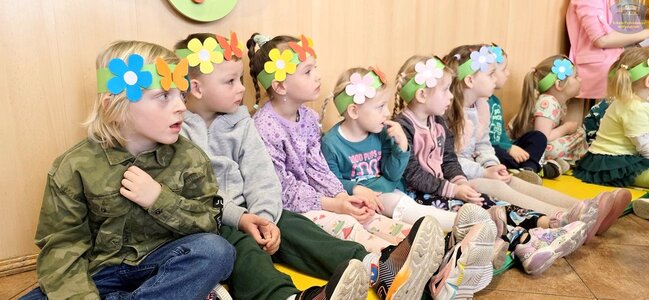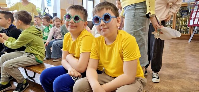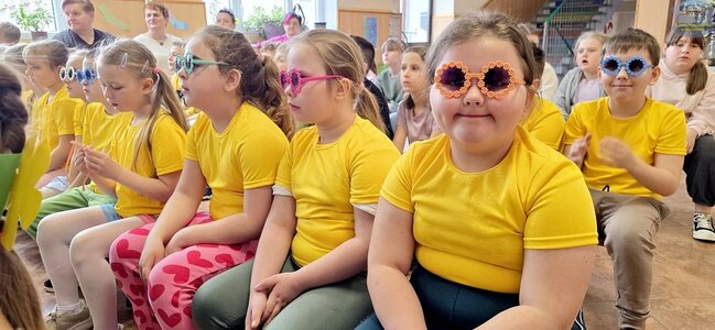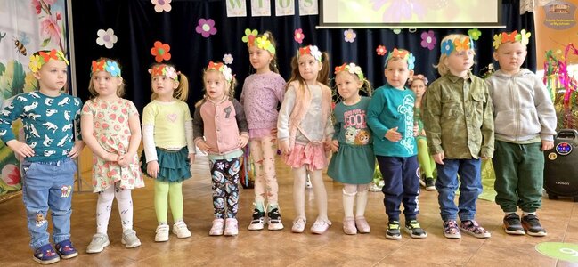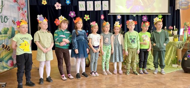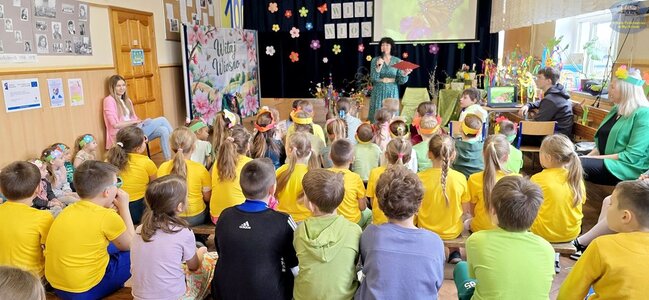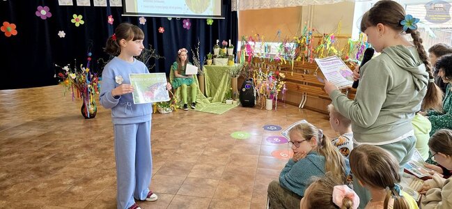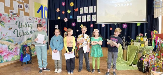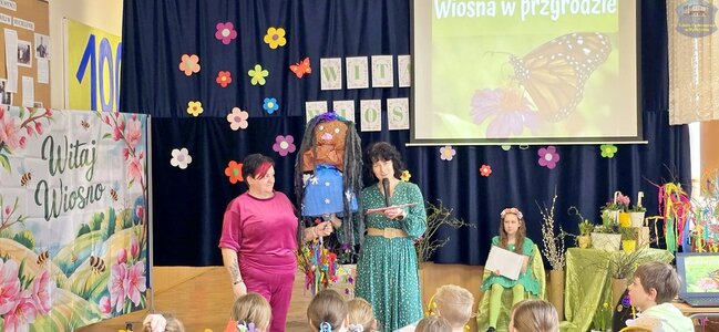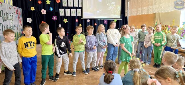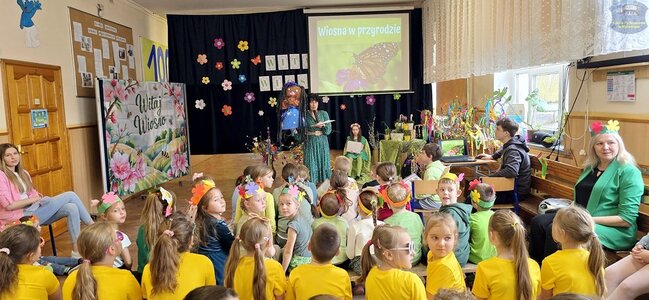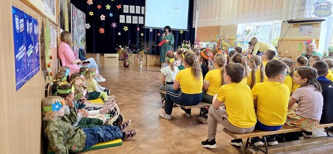 Pierwszy dzień wiosny przywitaliśmy z ogromnym entuzjazmem! Uczniowie klas 1–3 oraz nasze przedszkolaki z grup „Biedronki” i „Motylki” zamienili szkolne korytarze w kolorową, kwiecistą łąkę.