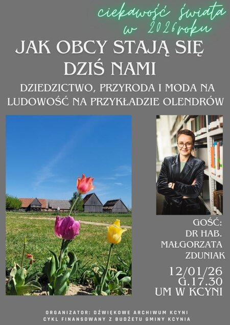 Spotkanie w dniu 12 stycznia 2026 roku upłynie pod hasłem "Jak obcy stają się dziś nami. Dziedzictwo, przyroda i moda na ludowość na przykładzie Olendrów". Początek o godz. 17.30 w sali nr 1 Urzędu Miejskiego w Kcyni, ul. Rynek 23. Wstęp wolny.