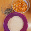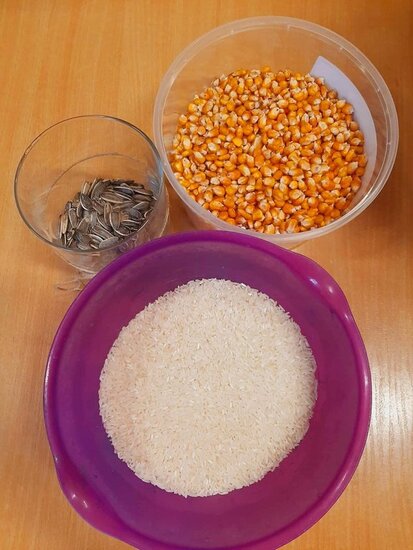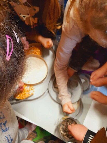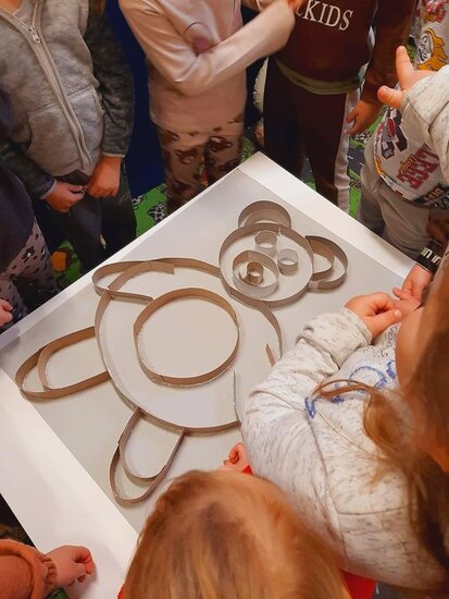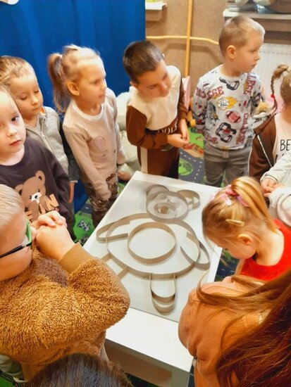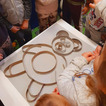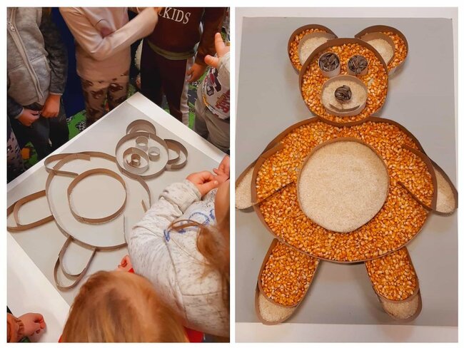 Dzieci w przedszkolu podczas pracy grupowej# stworzyły misia wykorzystując produkty takie jak słonecznik, ryż i kukurydzę.