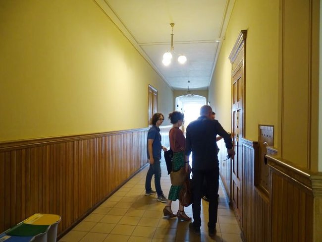Zadanie przewidywało poprawę stanu technicznego i estetycznego korytarzy. W związku z tym zostały usunięte warstwy wtórne, wykonano wzmocnienia strukturalne oryginalnych tynków oraz uzupełnienie ubytków. Obramienia i naczółki wszystkich drzwi zrekonstruowano na wzór oryginalnych, zachowanych w jednym z pomieszczeń. Ponadto obniżono wysokość boazerii i wykończono profilowaną listwą dębową w kolorze ustalonym dla całej stolarki drewnianej.