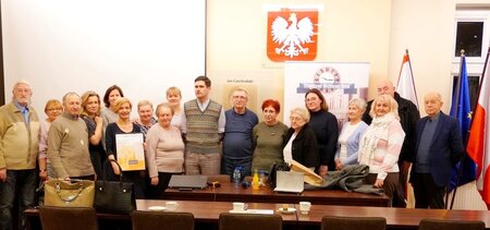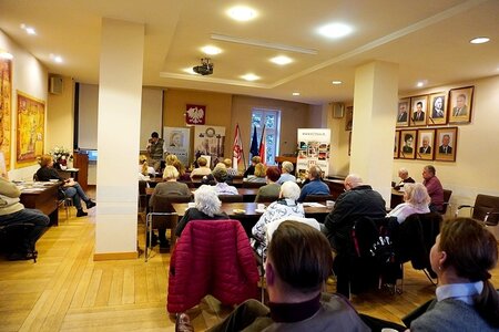 Spotkanie przebiegało w bardzo sympatycznej atmosferze, a jego uczestnicy dzielili się swoim odbiorem Warszawy. Nie zabrakło w nim tego, co jest nieodłącznym elementem Spacerów z Tytusem po dawnej Warszawie - czyli dowcipu, anegdotek, opowieści o światku przestępczym i arystokracji. W gawędzie naszego gościa pojawiły się dwie ważne postaci z międzywojnia: pułkownik Bolesław Wieniawa-Długoszowski oraz Tata Tasiemka, czyli przywódca warszawskiego półświatka (właśc. Łukasz Siemiątkowski). Elementy ich biografii, anegdoty czy zabawne zdarzenia obecne były w wystąpieniu Sebastiana "Tytusa" Suskiego. Nasz gość postanowił przybliżyć nam również elementy gwary warszawskiej, a także przeczytał fragmenty prozy Stefana Wiecha. Wskazywał, że stosowana przez niego gawęda miejska - opowieści, dla których inspiracją są prawdziwe wydarzenia, a które ewoluują w stronę legendy - ma swoje miejsce na organizowanych przez niego spacerach. Finalnie ludzie zostają z opowieścią - podkreślał. Na koniec naszych warsztatów był czas na wykonanie pamiątkowej fotografii i rozmowy w kuluarach. Uczestnicy spotkania dzielili się swoim indywidualnym odbiorem Warszawy - czy to sprzed kilku lat, czy to, jak jedna z uczestniczek, sprzed 78 laty.