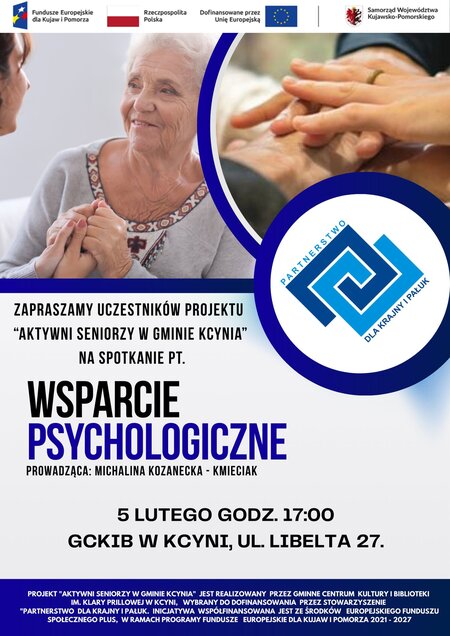 Zapraszamy uczestników projektu# "Aktywni Seniorzy w gminie Kcynia" na ostanie warsztaty z psychologiem, panią Michaliną Kozanecką - Kmieciak.
