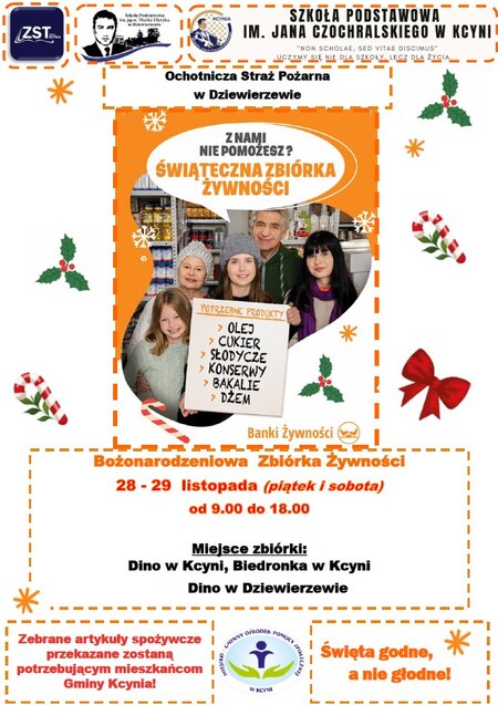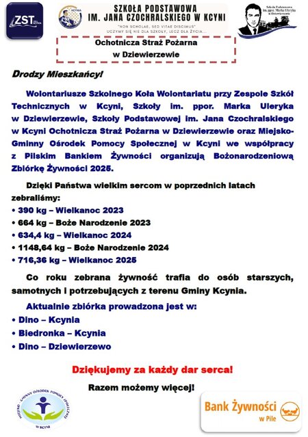 Wolontariusze Szkolnego Koła Wolontariatu #przy Zespole Szkół Technicznych w Kcyni, Szkoły im. ppor. Marka Uleryka w Dziewierzewie, Szkoły Podstawowej im. Jana Czochralskiego w Kcyni, Ochotnicza Straż Pożarna w Dziewierzewie oraz Miejsko-Gminny Ośrodek Pomocy Społecznej w Kcyni, we współpracy z Pilskim Bankiem Żywności, organizują Bożonarodzeniową Zbiórkę Żywności 2025.