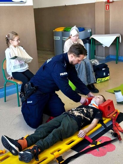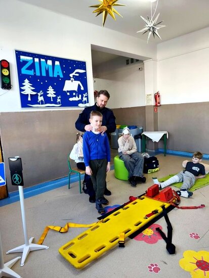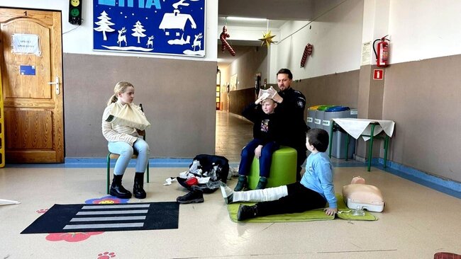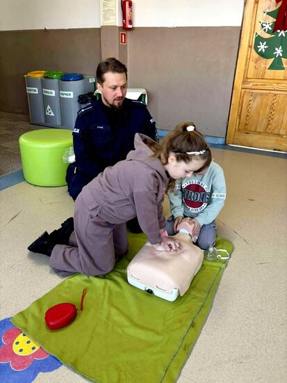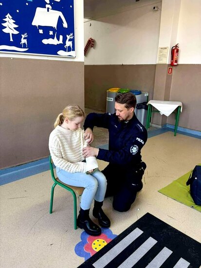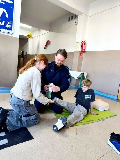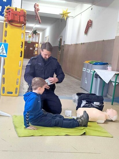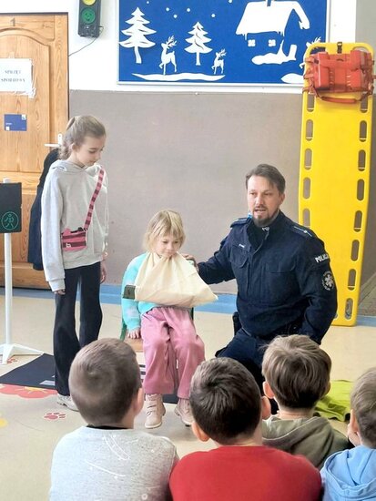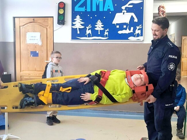 Policjant poruszył najważniejsze kwestie związane z zachowaniem bezpieczeństwa podczas zimowych zabaw. Uczniowie mieli również okazję zdobyć umiejętności praktyczne i wiedzę dotyczącą podstawowych zasad udzielania pierwszej pomocy przedmedycznej. Spotkanie było niezwykle ważną lekcją, która z pewnością wpłynie na poprawę bezpieczeństwa dzieci. Nabyte umiejętności pozwolą zachować spokój w sytuacjach wymagających udzielenia pomocy na miejscu zdarzenia. Zajęcia wzbudziły bardzo duże zainteresowanie wśród uczniów, którzy bardzo chętnie brały czynny udział w spotkaniu.