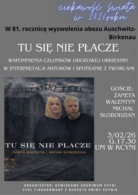 Kilka dni po radiowej premierze# audiodokumentu Tu się nie płacze zapraszamy Państwa na wyjątkowe spotkanie. We wtorek, 3 lutego o g. 17.30 w Urzędzie Miejskim w Kcyni, w ramach cyklu "Ciekawość świata" wspólnie wysłuchamy tej produkcji audio, a także porozmawiamy z jej twórcami. Spotkanie odbędzie się z udziałem autorów audiodokumentu: Żanety Walentyn i Michała Słobodziana - dziennikarzy, reportażystów Radia PIK. Będzie elementem obchodów 81. Rocznicy wyzwolenia obozu Auschwitz-Birkenau.