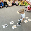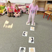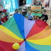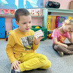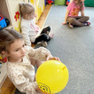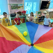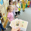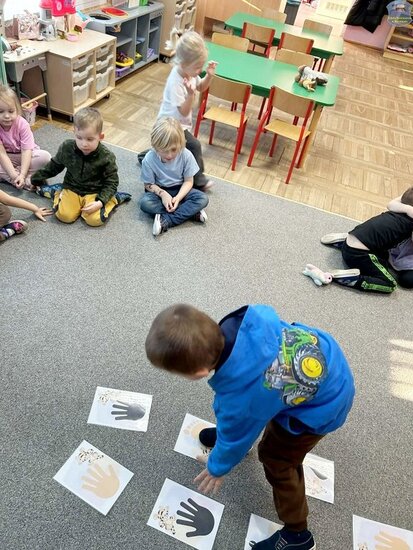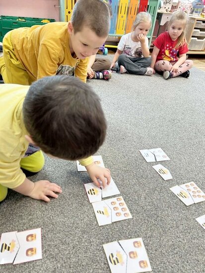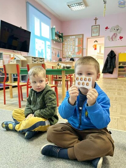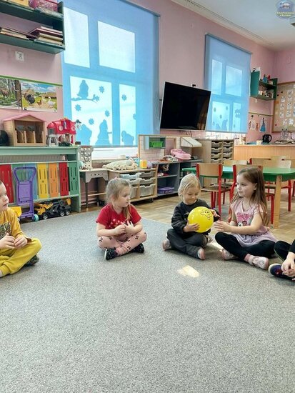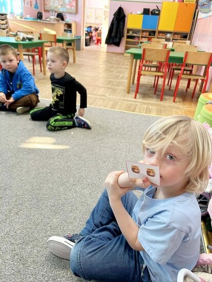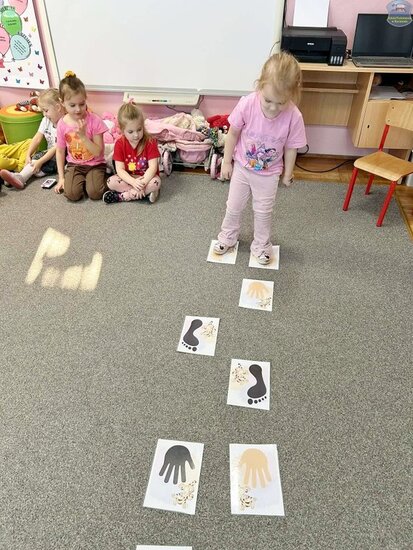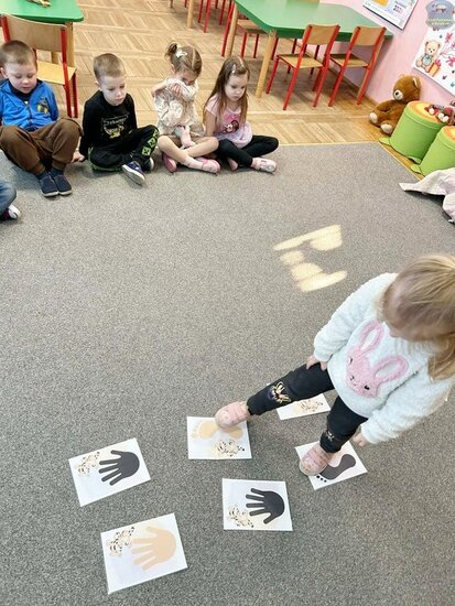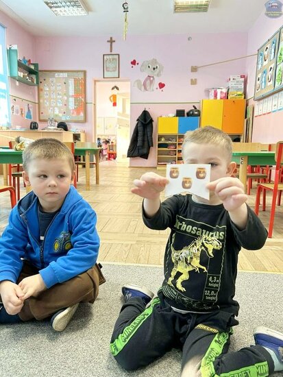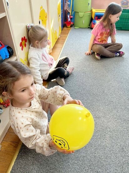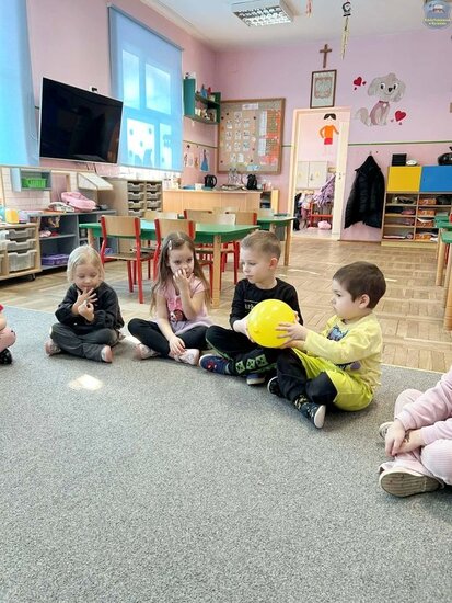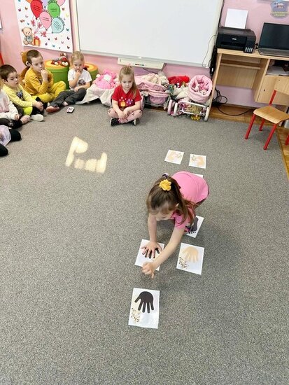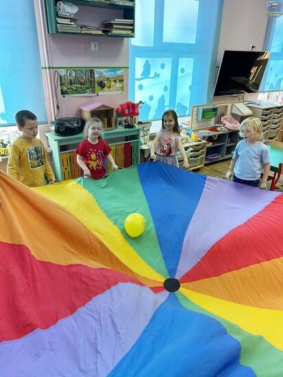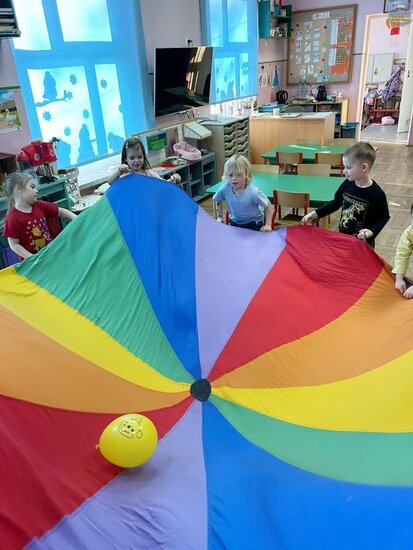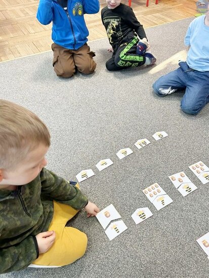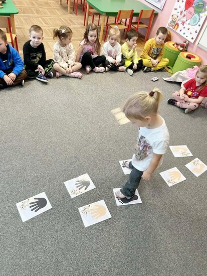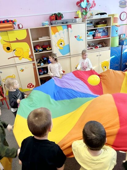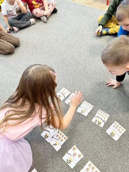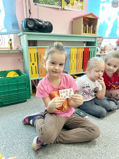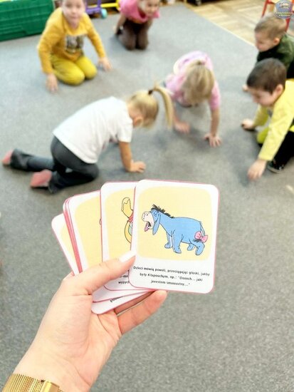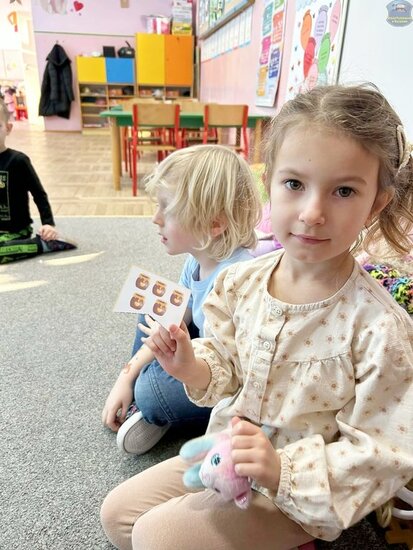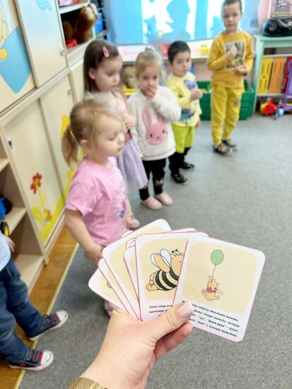 Na początku dzieci poznały postacie z bajki o Kubusiu Puchatku, przypominając sobie ich imiona oraz charakterystyczne cechy. Następnie przedszkolaki aktywnie uczestniczyły w zabawach z kartami ruchowymi, które zachęcały do aktywności fizycznej i współpracy. Nie zabrakło również zadania matematycznego — dzieci dopasowywały cyfry do odpowiedniej liczby „miodków”, ćwicząc liczenie i spostrzegawczość. Dużo radości sprawiły także zabawy z chustą animacyjną.
