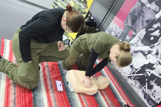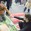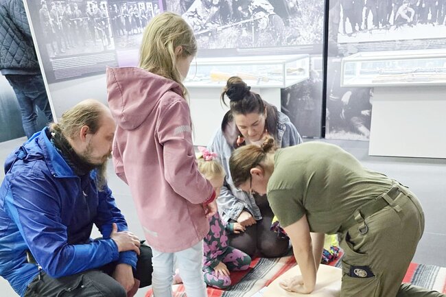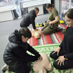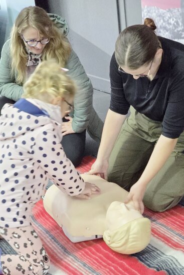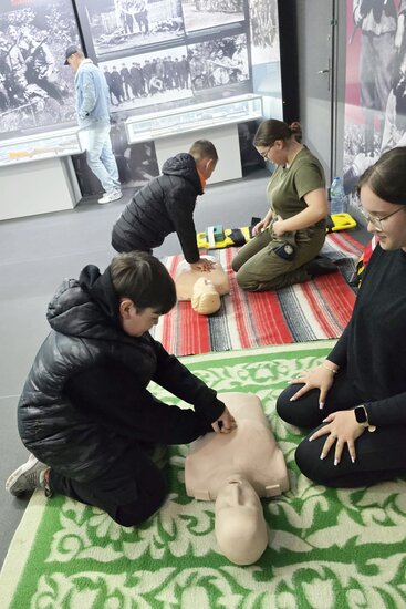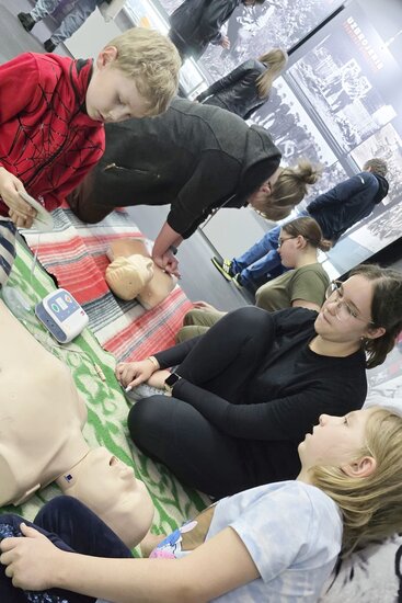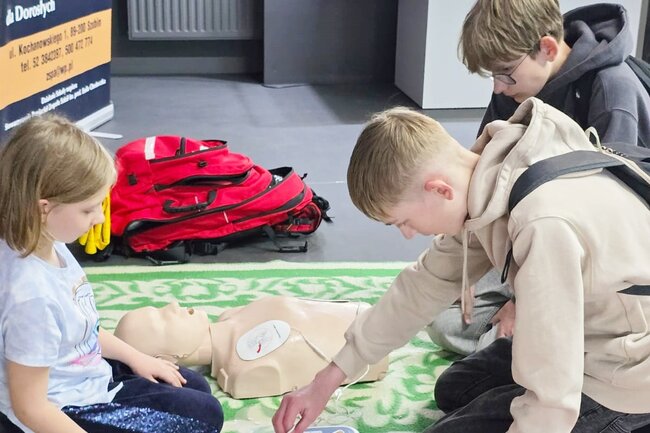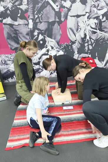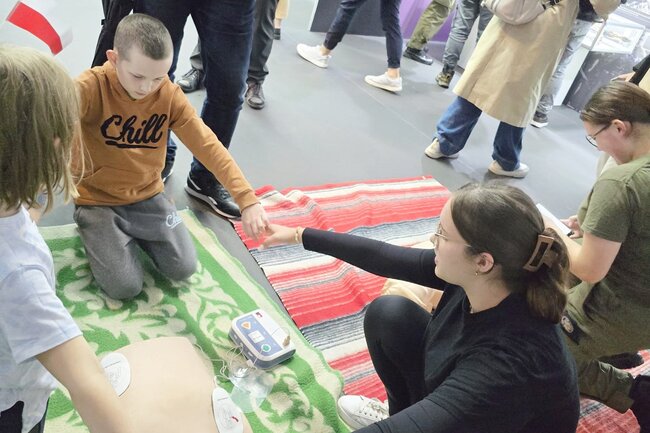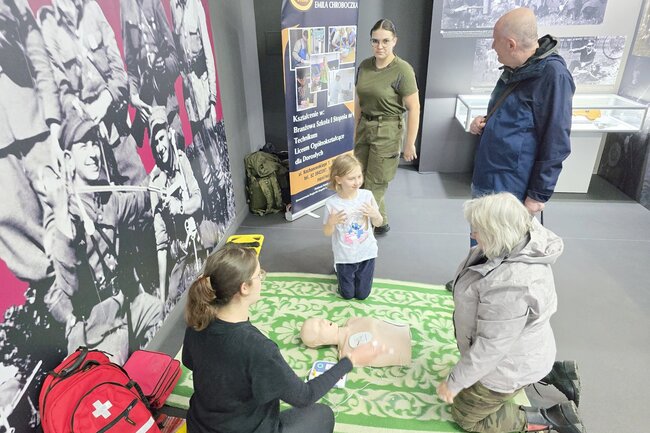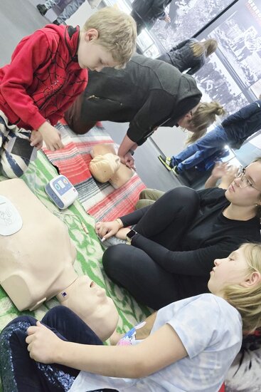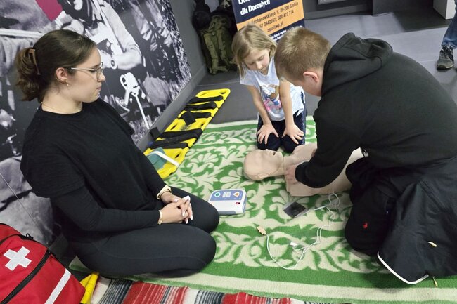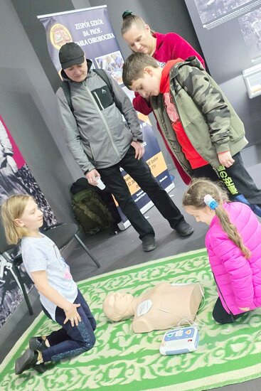 Stanowisko z udzielania pierwszej pomocy – uczestnicy mieli możliwość poznania podstawowych technik ratownictwa i przećwiczenia ich na fantomach, po dokonaniu wstępnego szkolenia przez kadetów: Agatę Kaizer, Julię Maras oraz Olę Maras. Można było przećwiczyć zabiegi resuscytacji krążeniowo-oddechowej i użycie AED. Dzięki aplikacji, z którą współpracował fantom kontrolowano jakość uciśnięć klatki piersiowej oraz wykonanych workiem samorozprężalnym wdechów. Fantom został zakupiony, w ramach projektu zajęć pozalekcyjnych, dofinansowanych przez Powiat Nakielski, pn.: „PIERWSZA POMOC – TO PROSTE”, którego koordynatorem jest Izabella Bodnar.