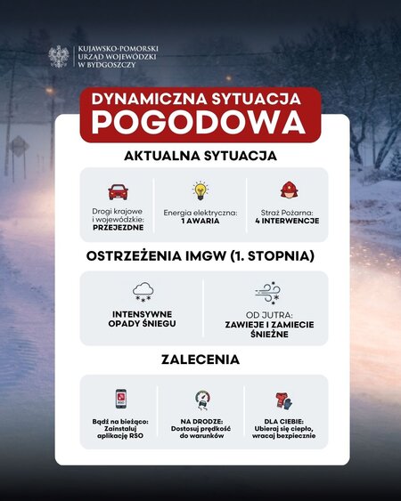 Od jutra prognozowane są zawieje i zamiecie śnieżne w powiatach: aleksandrowski, inowrocławski, mogileński, radziejowski, żniński, bydgoski, Bydgoszcz, chełmiński, nakielski, sępoleński, świecki, Toruń, toruński, tucholski. Wiatr może osiągać w porywach do 55 km/h, co przy padającym śniegu znacznie ograniczy widoczność.
