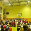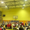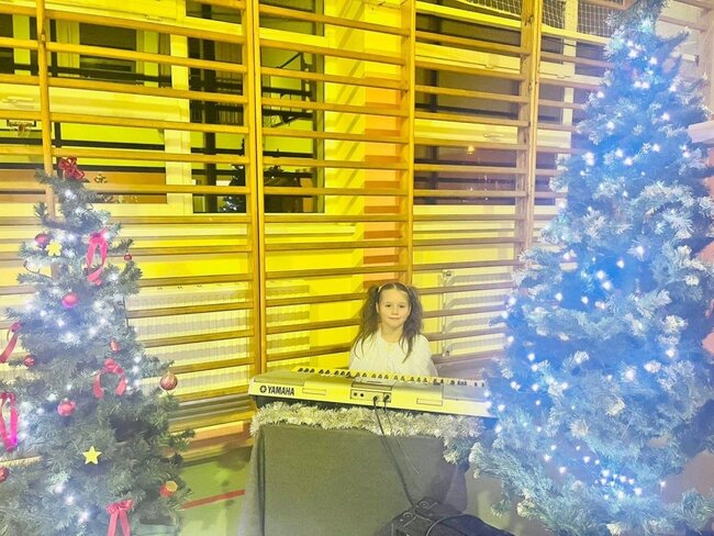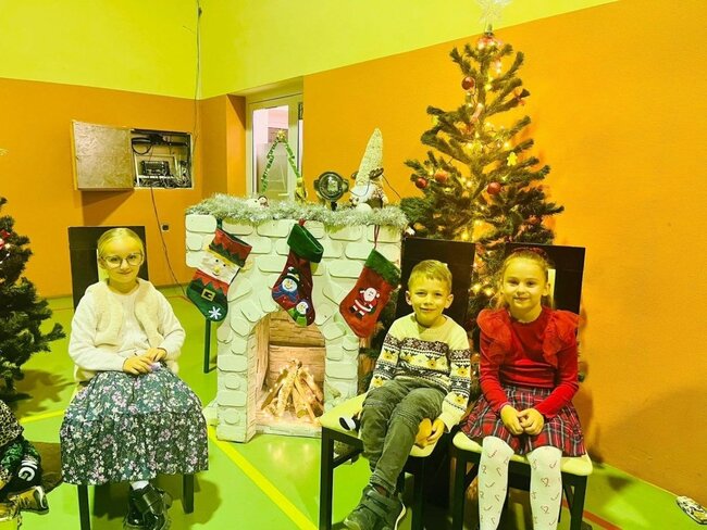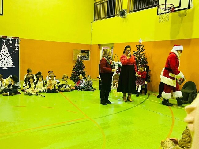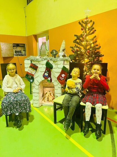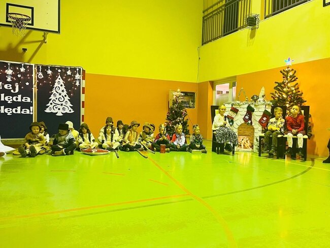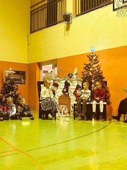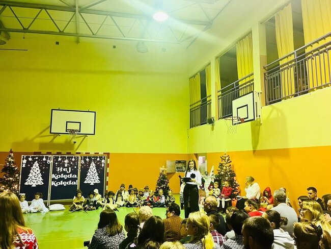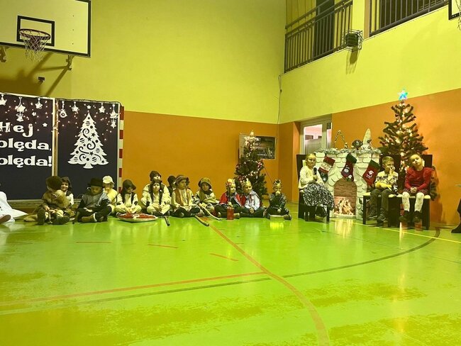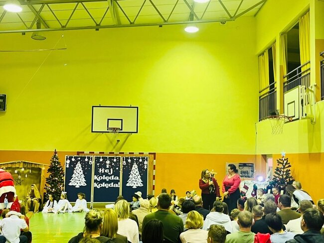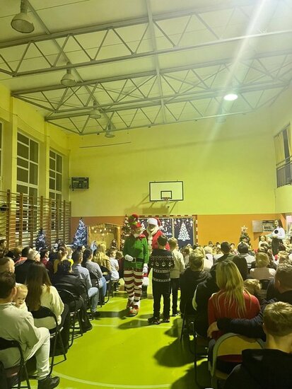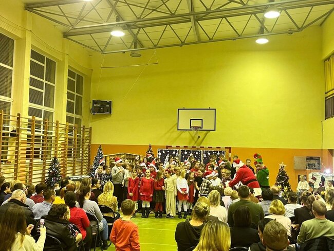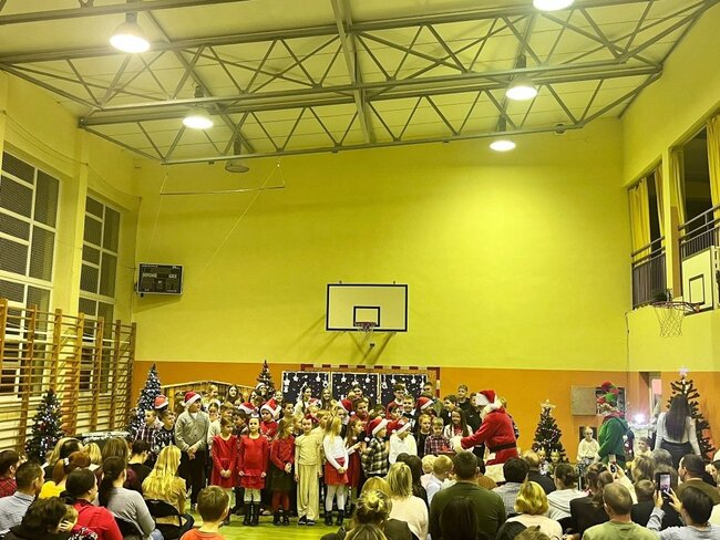 Następnie uczniowie całej szkoły wspólnie zaśpiewali świąteczny utwór, który był wzruszającym przekazem życzeń dla rodziców oraz zaproszonych gości. Nie zabrakło również wyjątkowego gościa — Świętego Mikołaja, który w podziękowaniu za wspaniałe występy obdarował wszystkie dzieci słodkościami.