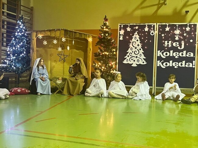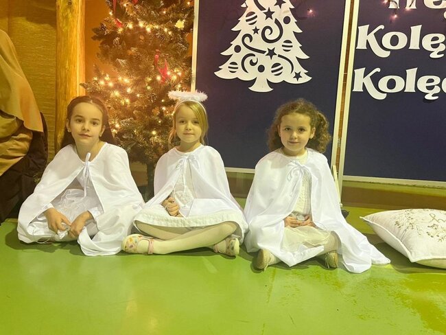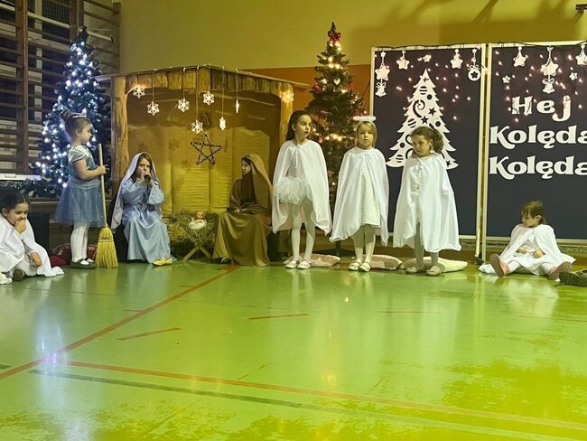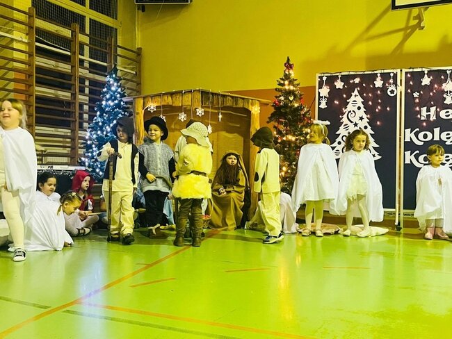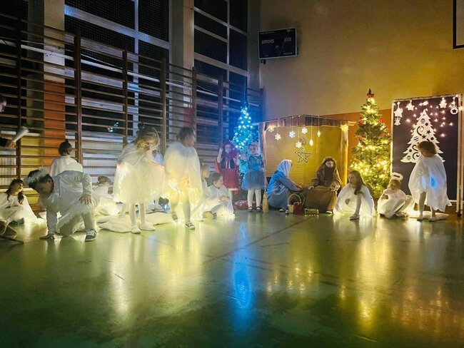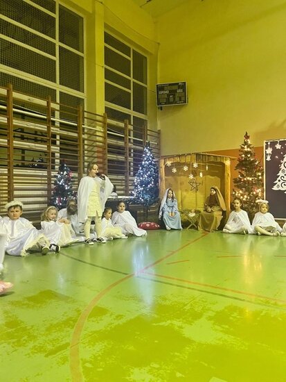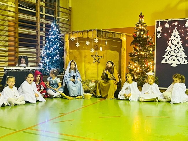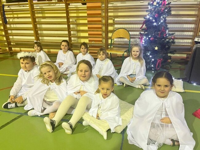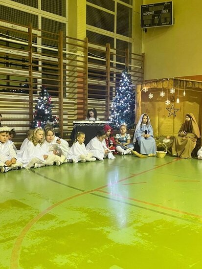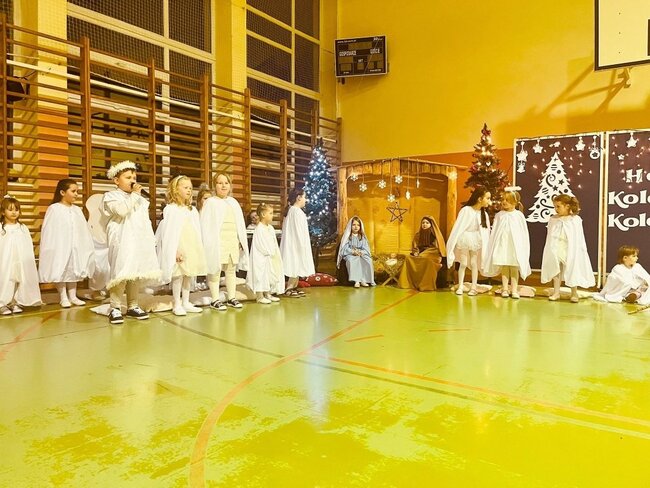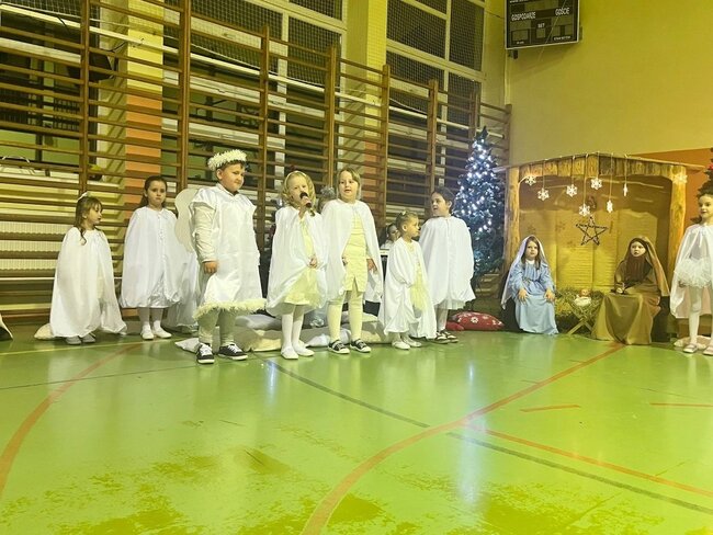 Kolejnym punktem programu był urokliwy występ oddziałów przedszkolnych, które zaprezentowały piękne jasełka. Mali artyści zachwycili publiczność, a taniec aniołków skradł serca wszystkich obecnych, wprowadzając prawdziwie świąteczny nastrój. Ogromne podziękowania kierujemy w stronę Pani Katarzyny Morzyńskiej, Pani Renaty Murawskiej i Pani Jagody Furtak za wspaniałe przygotowanie naszych najmłodszych artystów.