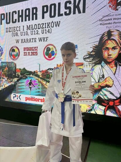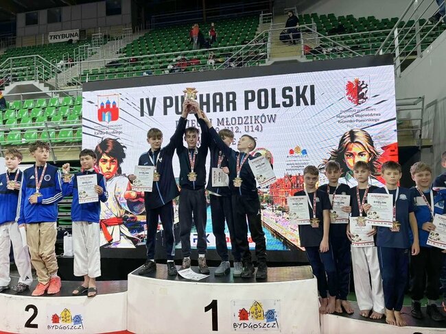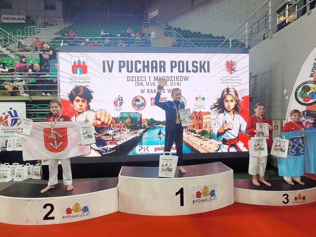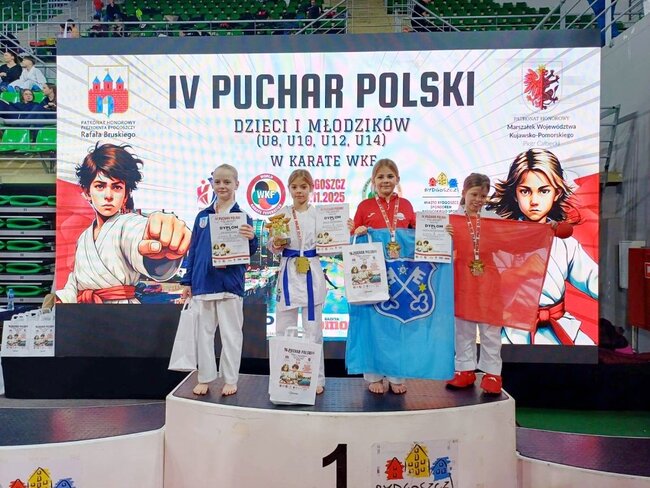 4 medale (dwa złote i dwa brązowe) to wynik zmagań zawodników# Klubu Karate Stowarzyszenie Sportowe Yamabushi podczas rozgrywanego w Bydgoszczy w dniu 23 listopada 2025 r. IV Pucharu Polski w Karate Dzieci i Młodzików.