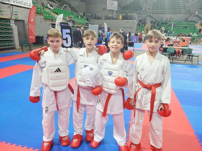 Filip Kołodziejski, Nikodem Góra, Igor Wdowiak, Tymon Wdowiak - kumite drużynowe chłopców U14 (-45 kg).