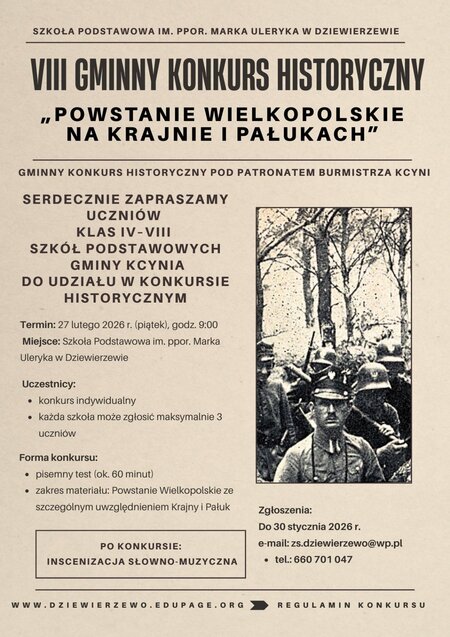Szkoła Podstawowa #im. ppor. Marka Uleryka w Dziewierzewie zaprasza uczniów klas IV–VIII szkół podstawowych gminy Kcynia do udziału w VIII Gminnym Konkursie Historycznym „Powstanie Wielkopolskie na Krajnie i Pałukach”, organizowanym pod patronatem Burmistrza Kcyni.