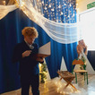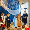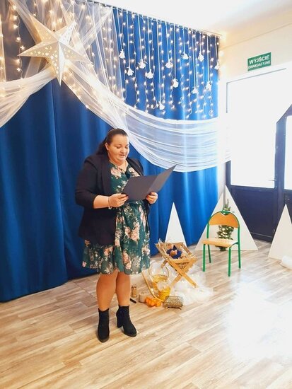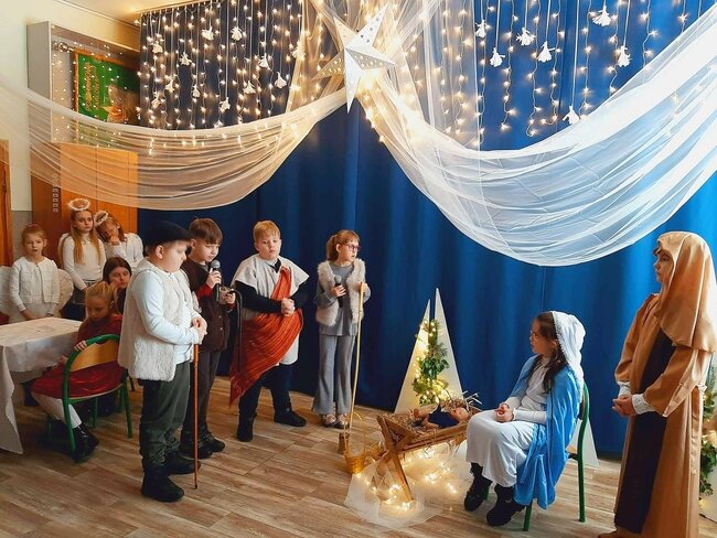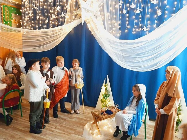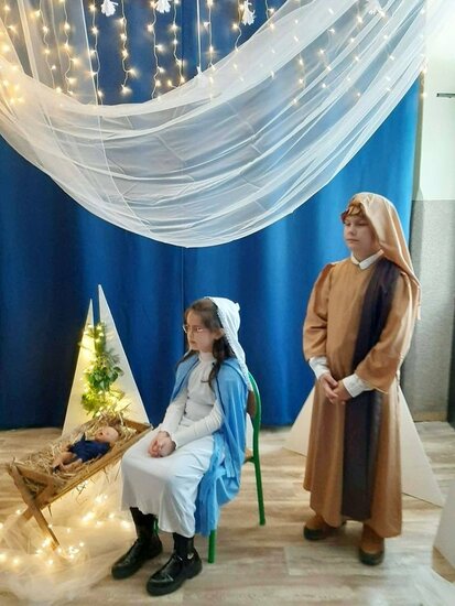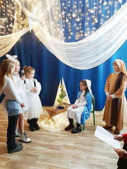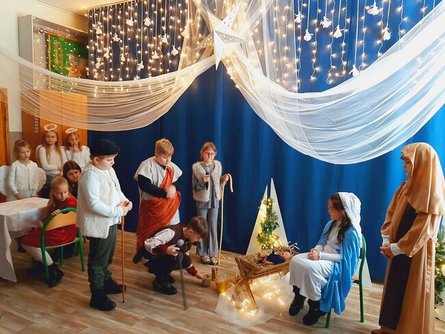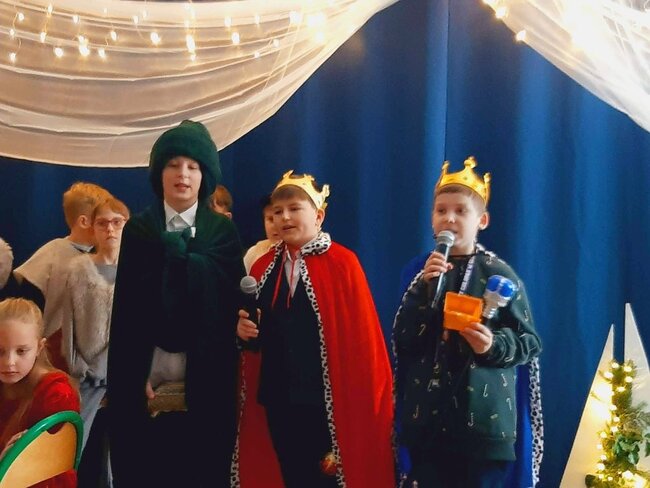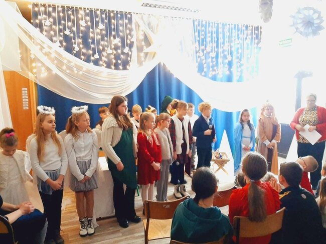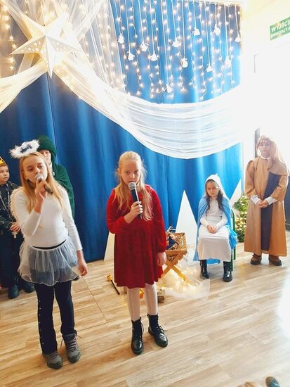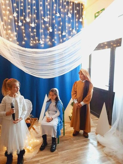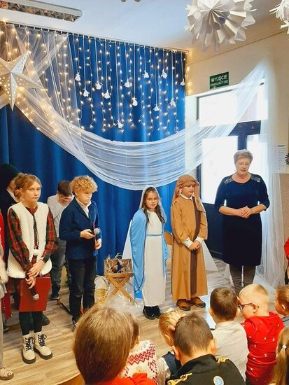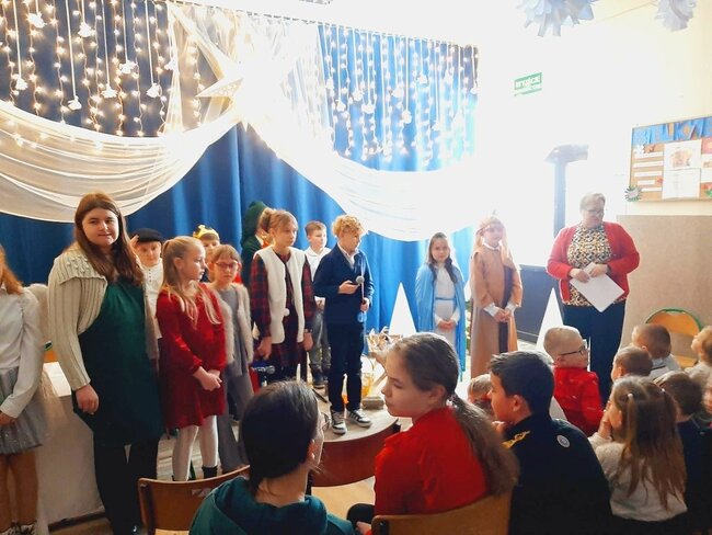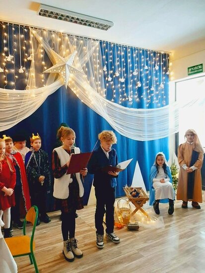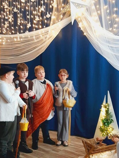 Uczniowie klasy drugiej i czwartej oraz Zuzia, Marysia, Patryk, Oliwier w pięknie przygotowanych strojach oraz w cudownej scenografii ukazali historię narodzin Chrystusa. Po zakończonym przedstawieniu głos zabrała pani dyrektor Ewa Tomaszek. Podziękowała uczniom za występ oraz złożyła życzenia noworoczne.