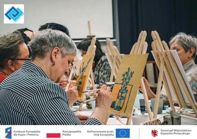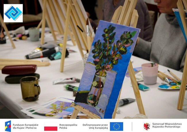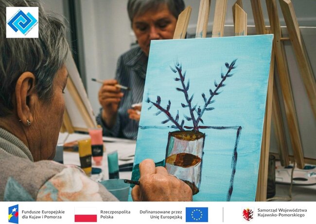 Podczas warsztatów seniorzy zmierzyli się z prawdziwym płótnem i farbami akrylowymi. Pracując na sztalugach stolikowych, pod czujnym i życzliwym okiem instruktorki, krok po kroku odkrywali tajniki malarstwa. Tematem spotkania była martwa natura, kwiaty w wazonie, które stały się inspiracją do stworzenia niezwykle barwnych i pełnych emocji prac.