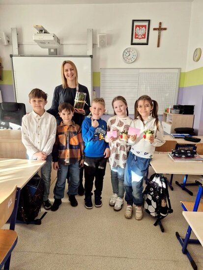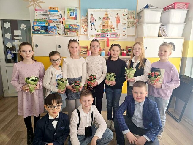 Nie zabrakło również pięknych gestów w klasach. Nasi chłopcy pamiętali o koleżankach – dziewczynki otrzymały kwiaty oraz słodkie upominki.