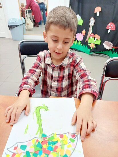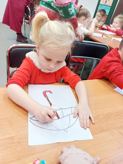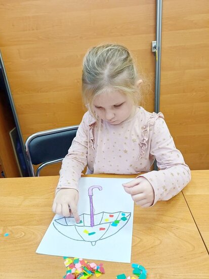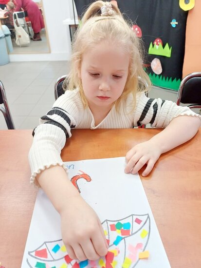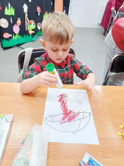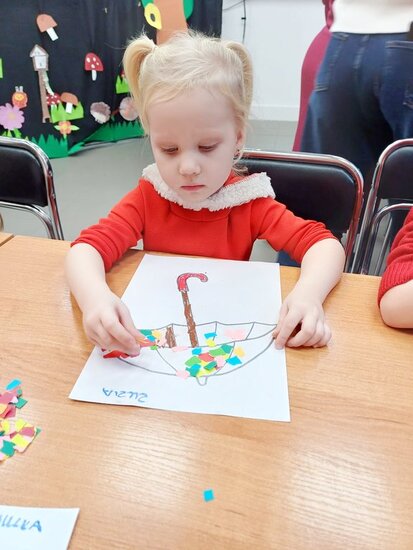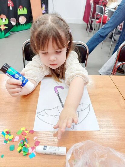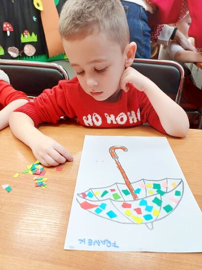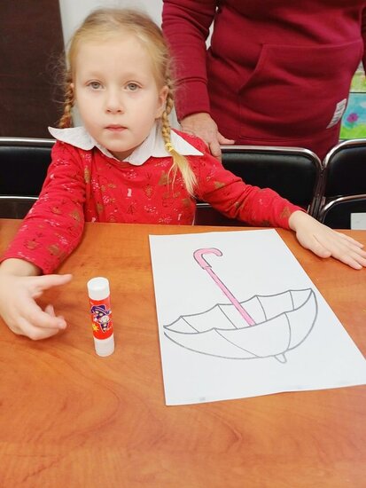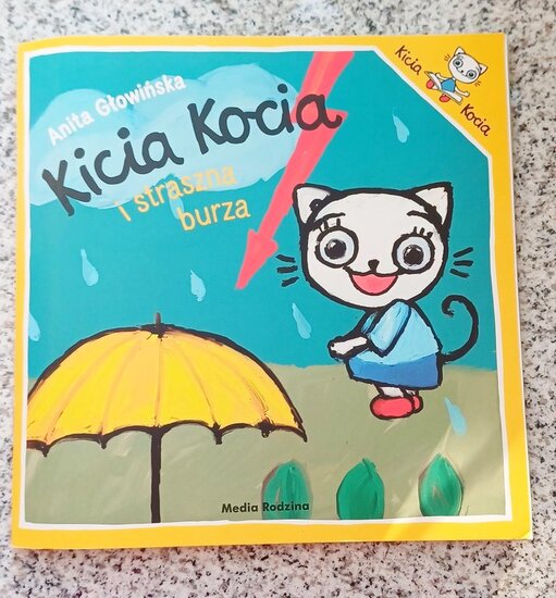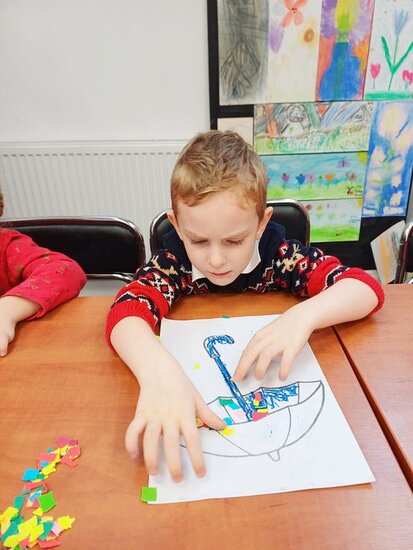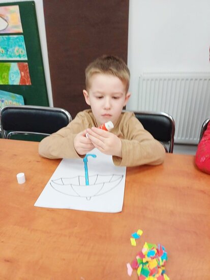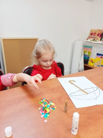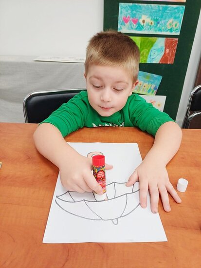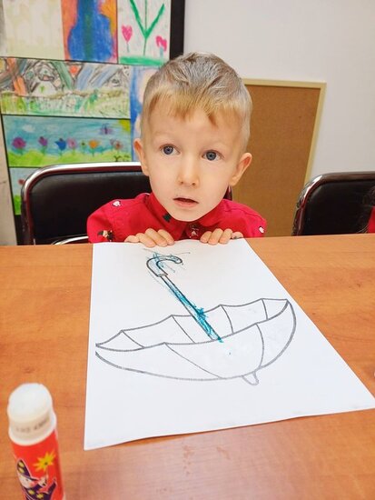 Pani Beata przeczytała dzieciom bajkę o Kici Koci i strasznej burzy. Następnie przedszkolaki wykonały wyklejankę - piękne kolorowe parasole.