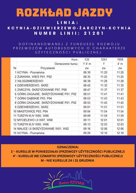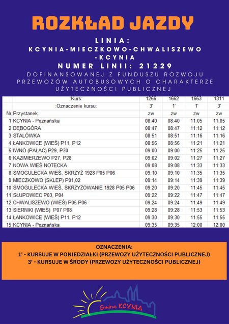 Przypominamy, że na terenie #Gminy Kcynia kursują autobusy dla mieszkańców. Realizacja połączeń możliwa jest dzięki uzyskanemu dofinansowaniu od Wojewody Kujawsko-Pomorskiego w ramach środków Funduszu Rozwoju Przewozów Autobusowych o charakterze użyteczności publicznej przy wsparciu finansowym z budżetu Gminy Kcynia.