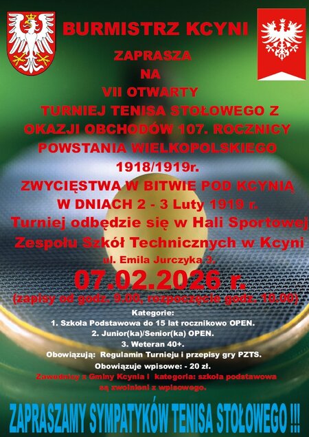 Zapraszamy na VII Otwarty Turniej #Tenisa Stołowego z okazji 107. Rocznica Powstania Wielkopolskiego zwycięstwa w Bitwie pod Kcynia w dniach 2- 3 luty 1919 r.