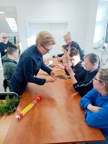 Uczestnikami warsztatów byli uczniowie Zespołu Szkół Specjalnych im. J.Koczaka w Kcyni z wychowawczynią Panią Kamilą Marosz. Zajęcia poprowadziła instruktorka Maria Kordyś, która wprowadziła uczestników w tradycję wykonywania palm charakterystycznych dla regionu Pałuk.