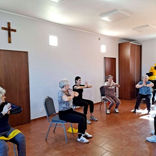 Ćwiczenia były dostosowane do możliwości wszystkich uczestników projektu „Z seniorem za rękę”, który od stycznia realizujemy w świetlicy w Dziewierzewie. Projekt skierowany jest do seniorów.