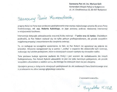 Na skrzynkę mailową Komendanta# Miejskiego Policji w Bydgoszczy wpłynęły podziękowania dla dzielnicowego z Łochowa młodszego aspiranta Roberta Rybickiego za jego postawę podczas czynności związanych ze skrajnie zaniedbanymi psami i kotami.