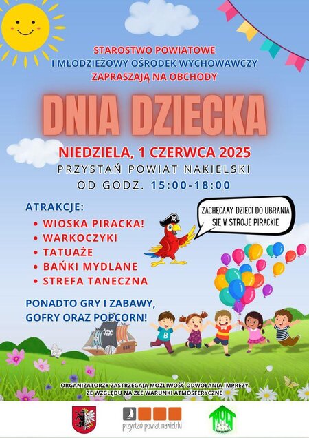 Starostwo Powiatowe oraz Młodzieżowy Ośrodek Wychowawczy zapraszają #na obchody Dnia Dziecka, które odbędą się w niedzielę, 1 czerwca 2025 roku, na Przystani Powiat Nakielski w godzinach od 15:00 do 18:00.
