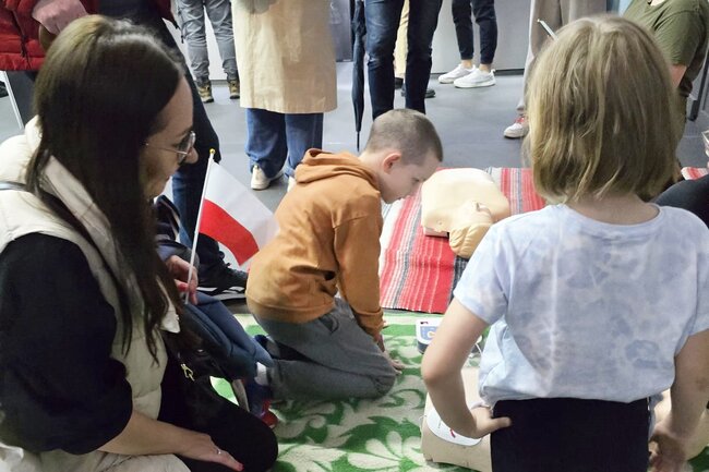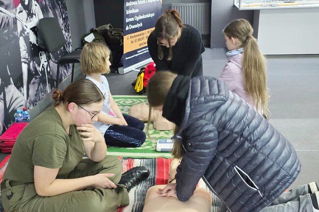 Stanowisko z udzielania pierwszej pomocy – uczestnicy mieli możliwość poznania podstawowych technik ratownictwa i przećwiczenia ich na fantomach, po dokonaniu wstępnego szkolenia przez kadetów: Agatę Kaizer, Julię Maras oraz Olę Maras. Można było przećwiczyć zabiegi resuscytacji krążeniowo-oddechowej i użycie AED. Dzięki aplikacji, z którą współpracował fantom kontrolowano jakość uciśnięć klatki piersiowej oraz wykonanych workiem samorozprężalnym wdechów. Fantom został zakupiony, w ramach projektu zajęć pozalekcyjnych, dofinansowanych przez Powiat Nakielski, pn.: „PIERWSZA POMOC – TO PROSTE”, którego koordynatorem jest Izabella Bodnar.