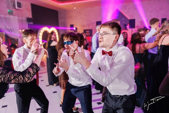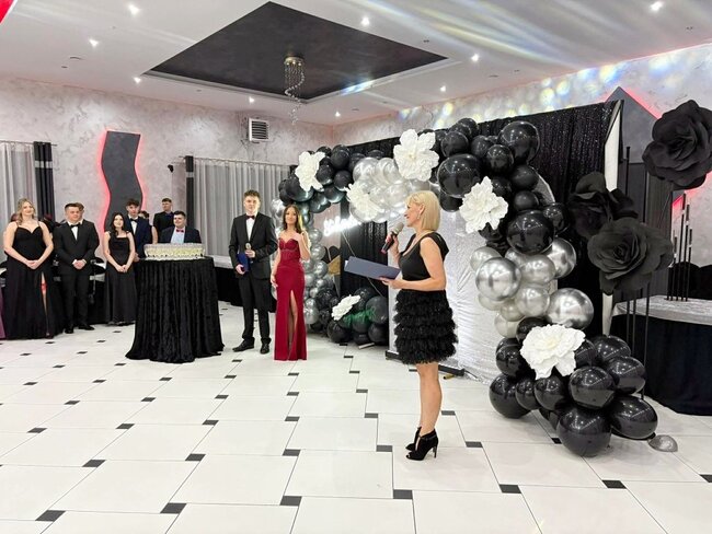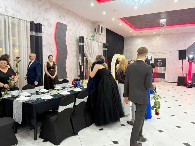 Wieczór od pierwszych chwil zachwycał atmosferą radości, wzruszeń i wspólnego świętowania. Uczniowie, we współpracy z Rodzicami, perfekcyjnie przygotowali całe wydarzenie – od oprawy organizacyjnej po dbałość o każdy szczegół. Eleganckie stroje, piękna dekoracja sali oraz doskonała muzyka sprawiły, że parkiet przez wiele godzin tętnił życiem.
