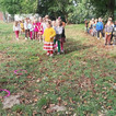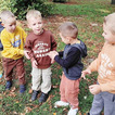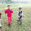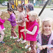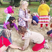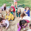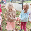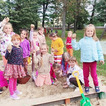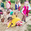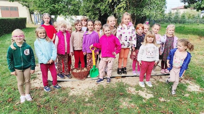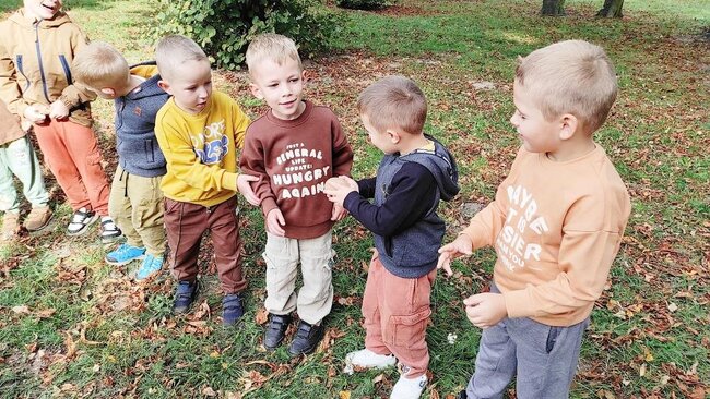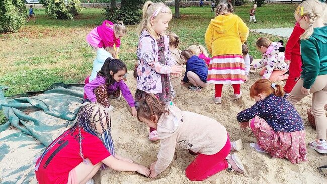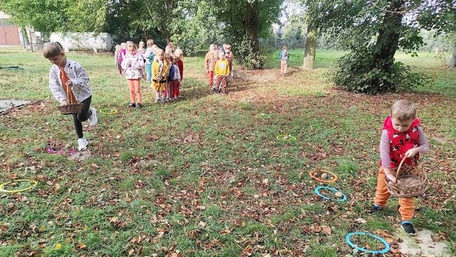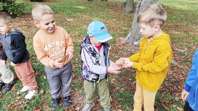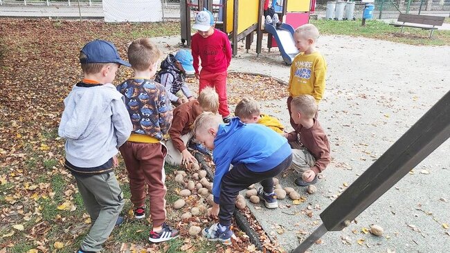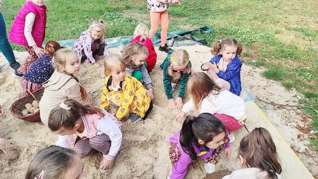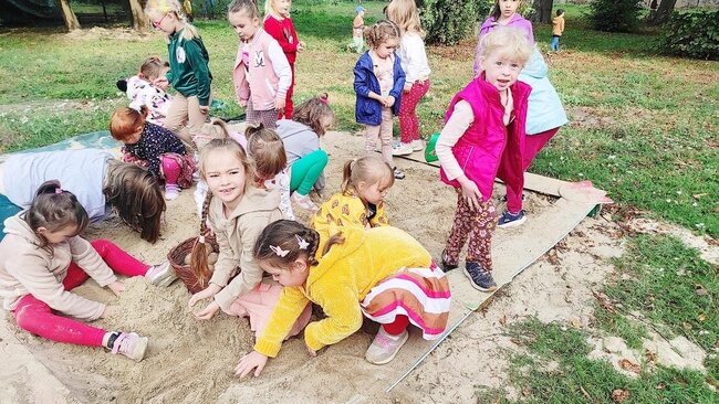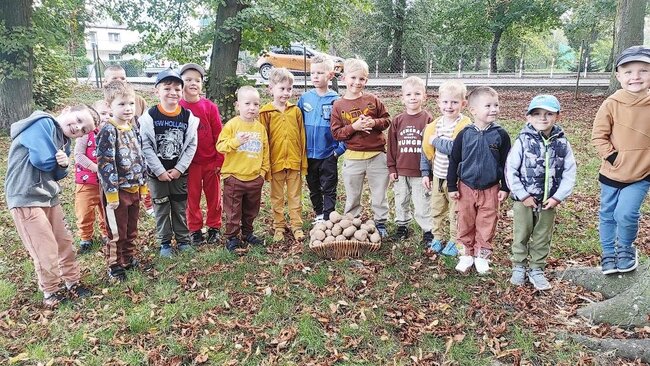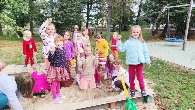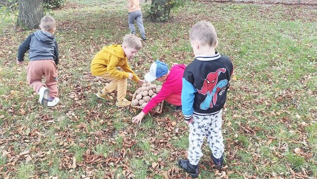 Następnie podzieleni na dwie drużyny udaliśmy się na wykopki. Grupa dziewcząt wylosowała piaskownicę, z której należało wybrać zakopane ziemniaki. Grupa chłopców wylosowała park i zajęła się zbieraniem ukrytych tam ziemniaków. Oba zespoły spisały się na medal. Z pełnymi koszami przeszliśmy do ziemniaczanych konkurencji. Przedszkolaki z grup "Wiewiórki" i "Sówki" z wielkim zapałem mierzyły się kolejno z wyzwaniami takimi jak: