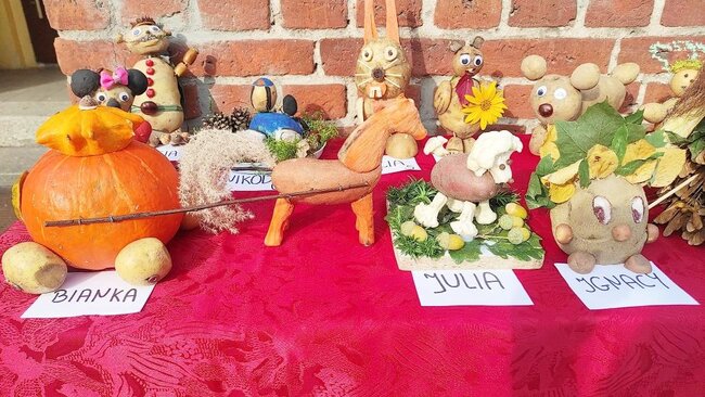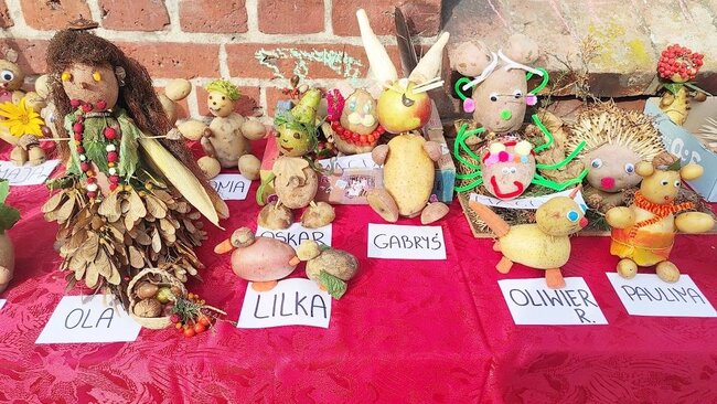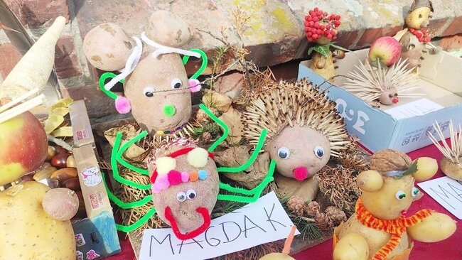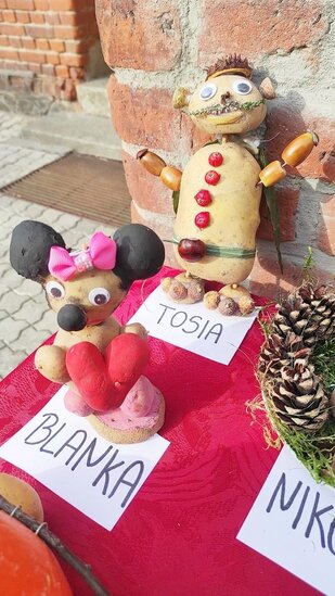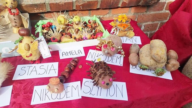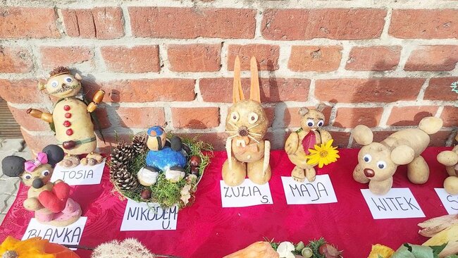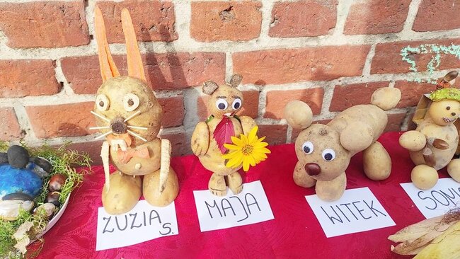 Dzień rozpoczęliśmy od wspólnego przygotowania wystawy prac konkursowych "Cudaki, potworki i inne ziemniaczane stworki". Dzieci razem z rodzicami wykonały kreatywne i niepowtarzalne dzieła. Celem konkursu było pobudzenie aktywności twórczej, rozwijanie i kształtowanie wyobraźni plastycznej, rozwijanie wrażliwości estetycznej oraz stworzenie dzieciom możliwości prezentacji własnych dokonań twórczych. Wszyscy uczestnicy konkursu zostali nagrodzeni dyplomami "Małego Artysty" i upominkami w postaci kolorowanki.