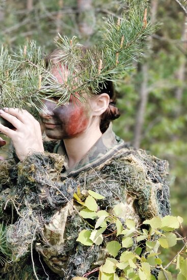 Podporucznik Łukasz Nieradko pokazał techniki maskowania się w różnych warunkach terenowych, tłumacząc, że sztuka kamuflażu sięga początków istnienia wojskowości – to wiedza, która od wieków pomaga żołnierzom ukrywać się przed wrogiem, zarówno podczas przepraw, jak i w czasie obozowania. Po tej części zajęć, kadeci przeszli do bardziej zaawansowanego elementu szkolenia, jakim było skryte przemieszczanie się w terenie. Ich celem było dotarcie do wyznaczonego punktu bez zostania wykrytym przez rozmieszczonych na trasie obserwatorów.