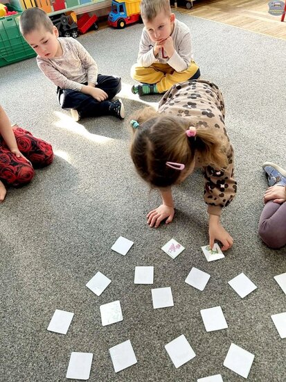 Dużo radości sprawiła gra „memory”, która pozwoliła ćwiczyć pamięć wzrokową oraz koncentrację uwagi. Dzieci odtwarzały i kontynuowały proste sekwencje, rozwijając logiczne myślenie oraz spostrzegawczość.