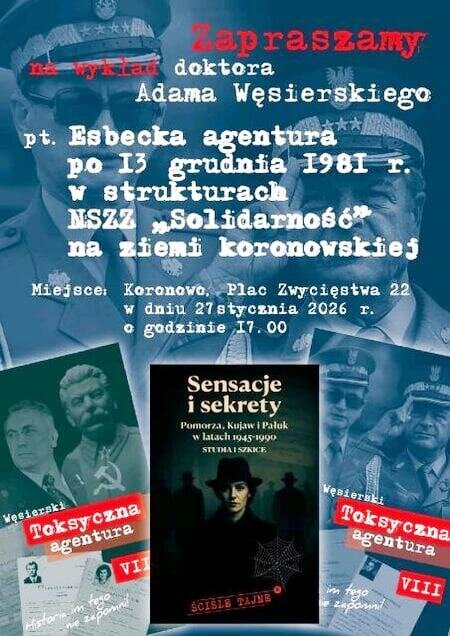 Tytuł prelekcji to: "Esbecka agentura po 13 grudnia 1981 r. w strukturach NSZZ „Solidarność” na ziemi koronowskiej". Spotkanie rozpocznie się o godz. 17.00 w budynku na ulicy Plac Zwycięstwa 22 w Koronowie. Będzie można nabyć publikacje autora.